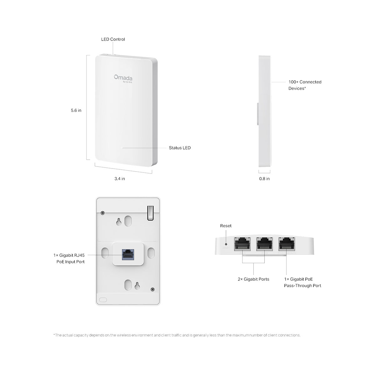 | • Superior WiFi 6 Speeds: Simultaneous 574 Mbps on 2.4 GHz and 1201 Mbps on 5 GHz totals 1775 Mbps Wi-Fi speeds.** • High-Performance Connectivity: Guarantee higher network efficiency and lower latency. • Four Gigabit Ports: 4 Gigabit Ethernet ports (1x uplink + 3x downlink), with one downlink port supporting PoE pass-through to provide power for wired device.‡ • Centralized Management: Integrates into Omada SDN for cloud access and remote management. • Secure Guest Network: Along with multiple authentication options (SMS/Facebook Wi-Fi/Voucher, etc.) and abundant wireless security technologies.† • Easy Installation and PoE Support: Easy-to-install design, compatible with 86 mm & EU & US standard junction box, and 802.3af/at PoE support. |