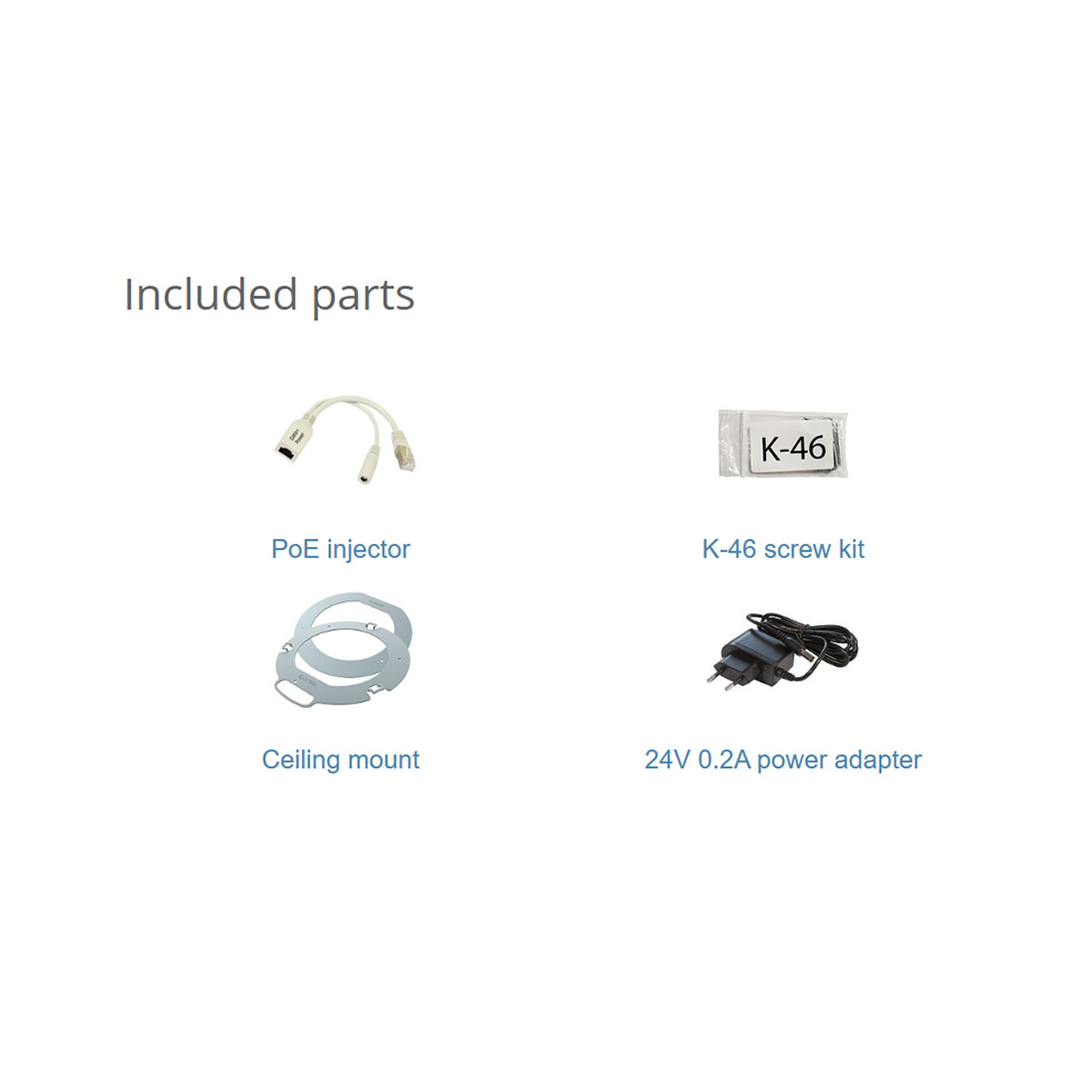 Everything is included to get you started, wall/ceiling mount, PoE injector, power adapter and even the screws and screw anchors.