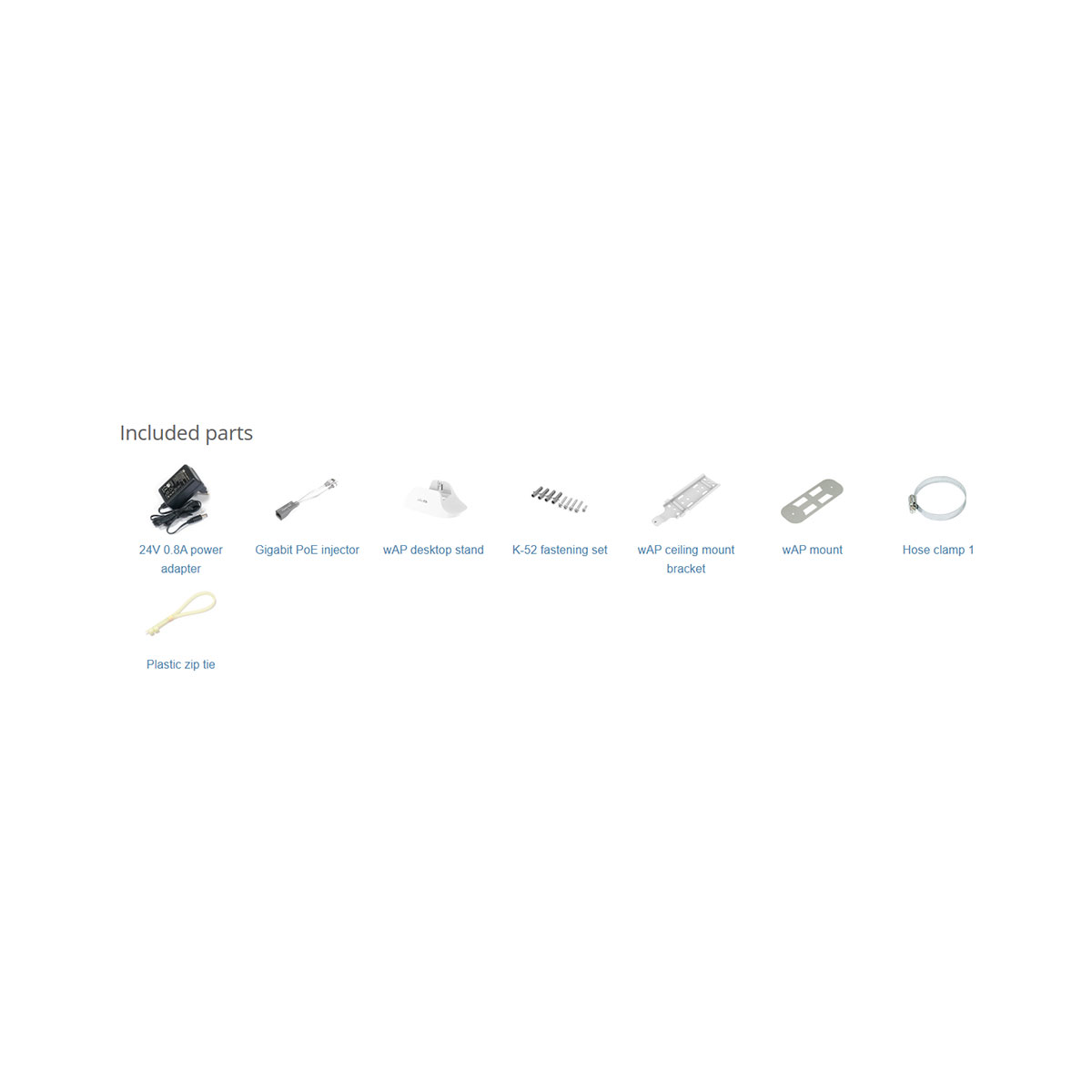 | Package contents | 24V 0.8A power adapter Gigabit PoE injector wAP desktop stand K-52 fastening set wAP ceiling mount bracket wAP mount Hose clamp 1 |