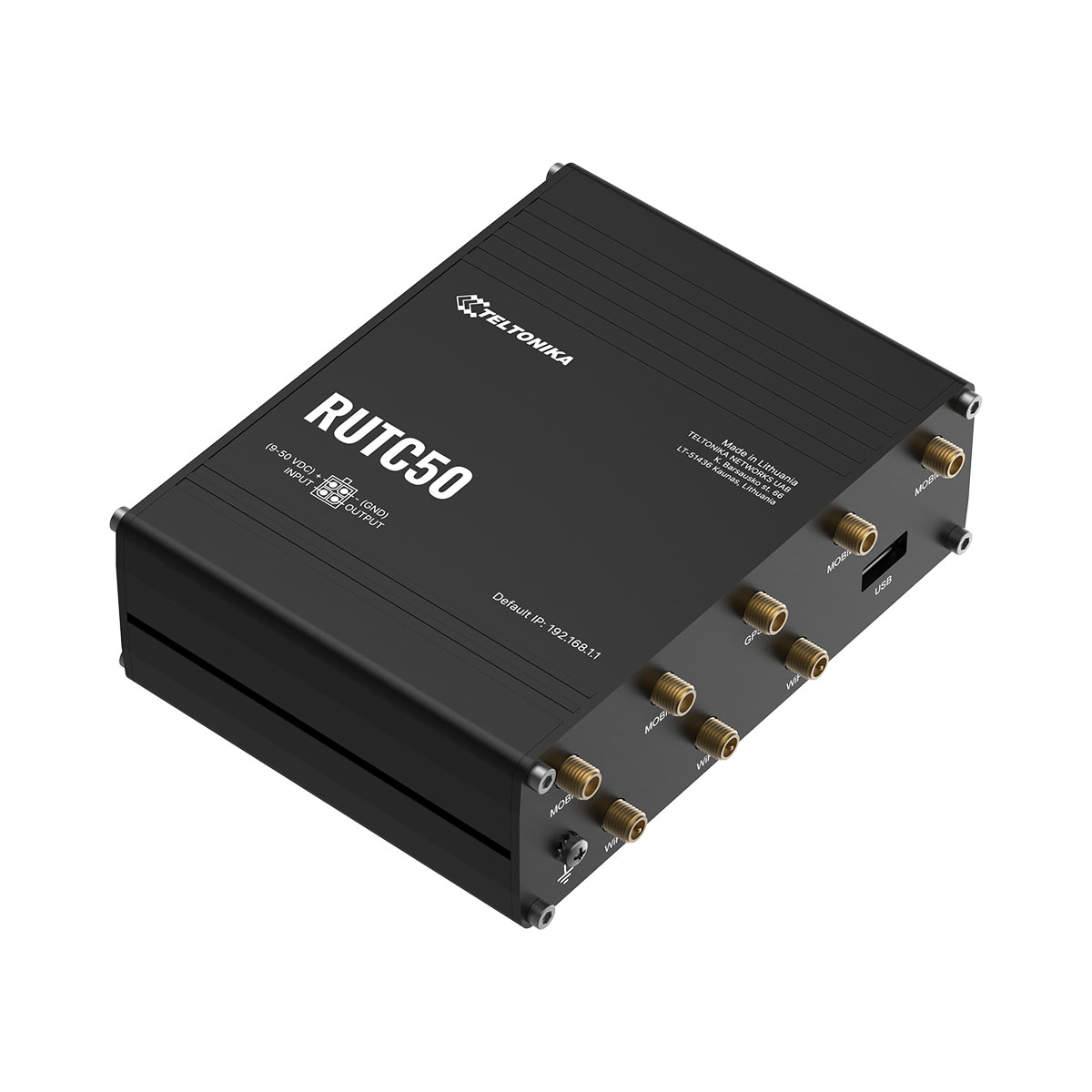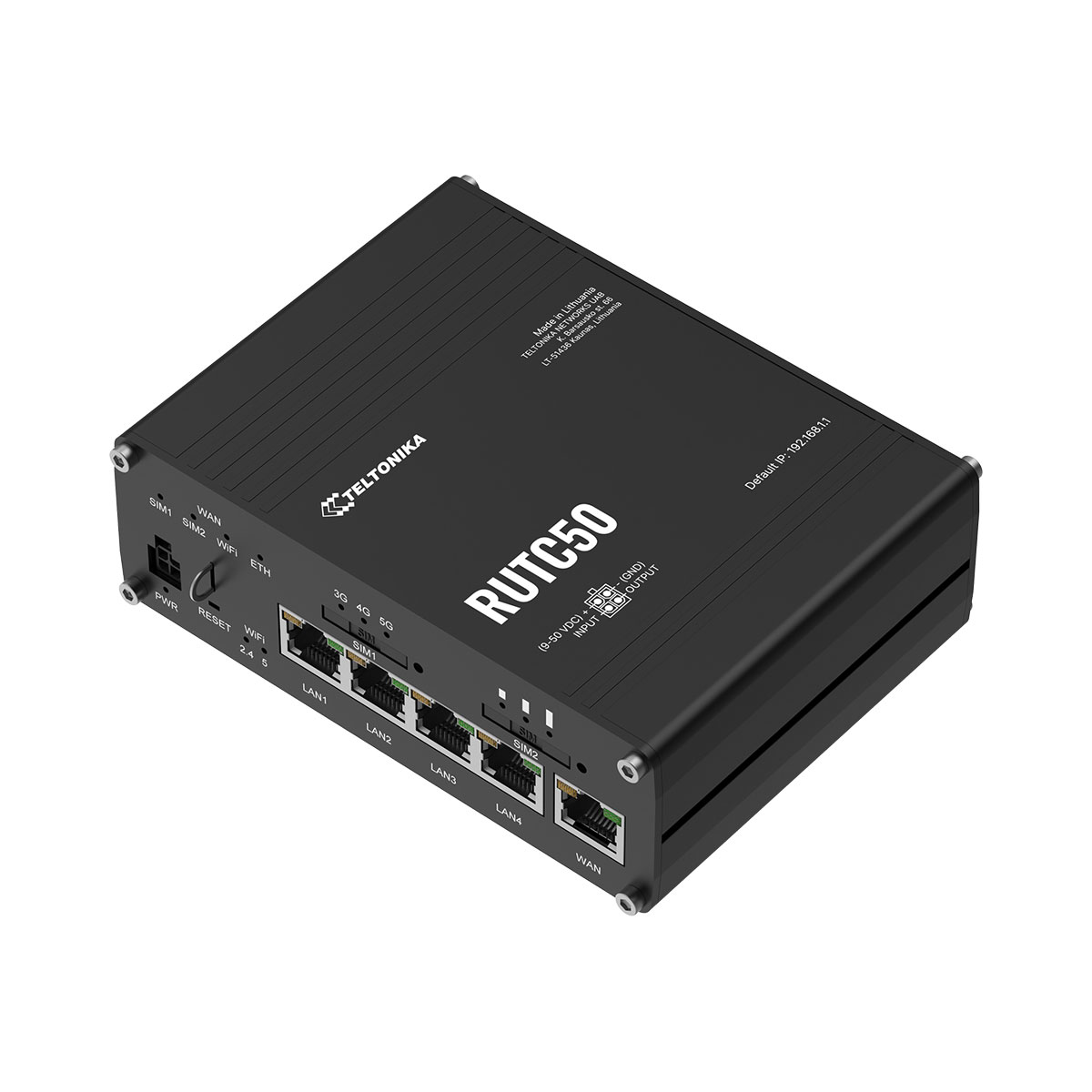 The RUTC50 is a 5G router featuring dual-band Wi-Fi 6 technology with multi-user MIMO, ensuring ultra-high cellular speeds of up to 3.4 Gbps. This 5G router is also equipped with dual SIM with auto-failover, five Gigabit Ethernet ports, and GNSS for precise location tracking. The RUTC50 supports both SA and NSA 5G architectures and is backward compatible with 4G (Cat 20) and 3G, ensuring robust and reliable performance.