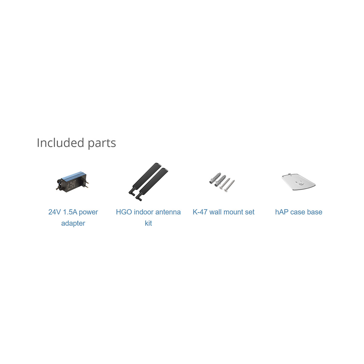 Included parts | • 24 V 1.5 A power adapter • Fastening set • HGO indoor antenna kit • Case base |