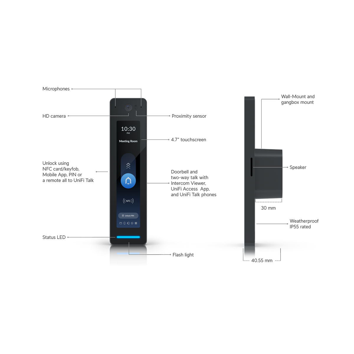 - Elegant NFC and Bluetooth access reader (UniFi identity)