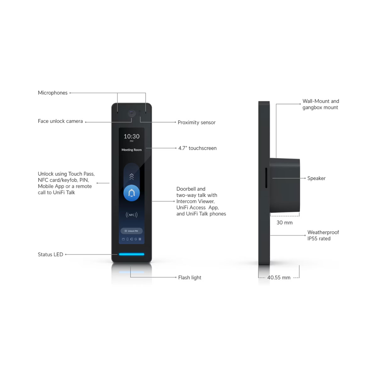 The Ubiquiti G3 Reader Pro is the third generation of access readers, supporting authorization via NFC card, Apple Touch Pass *, the UniFi Identity mobile app, face or a numeric code. With its doorbell function, camera, and built-in two-way audio, it allows communication with visitors. The IP55 certification ensures suitability for outdoor use.
