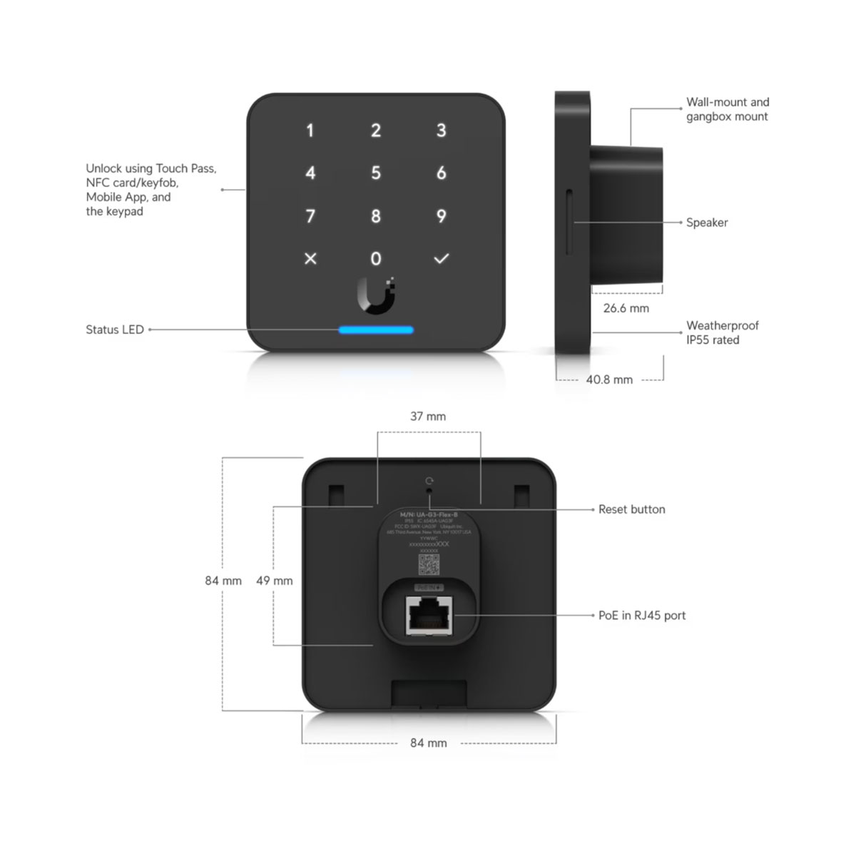 Ubiquiti Reader Flex is the third generation of access readers, supporting authorization via NFC card, Apple Touch Pass *, the UniFi Identity mobile app, or a numeric code. Thanks to the built-in speaker, it is possible to configure entry and exit greeting messages. The mechanical design of the keypad ensures functionality even with moisture or most gloves. Its IP55 certification guarantees suitability for outdoor use.