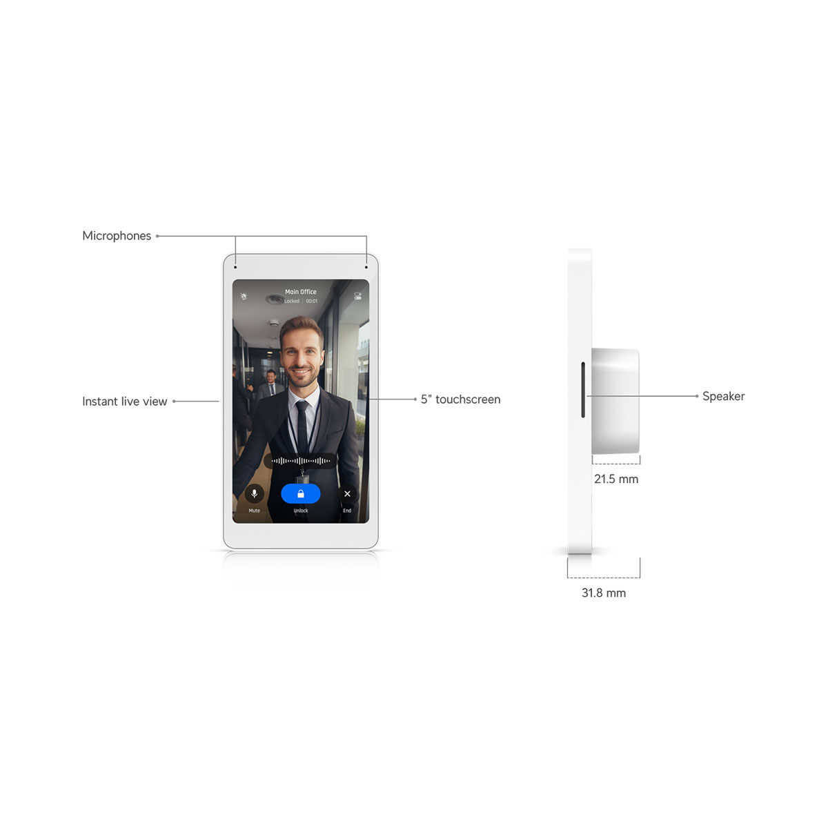 The professional indoor and very elegant video intercom unit from the UniFi Access series from Ubiquiti Networks is equipped with a 5" touch screen b> and two-way audio for access control within residential houses and commercial buildings. The intercom display communicates with other elements using a 802.3af PoE support, allows a live preview of what is happening at the input with the option to enable access on its touch screen.