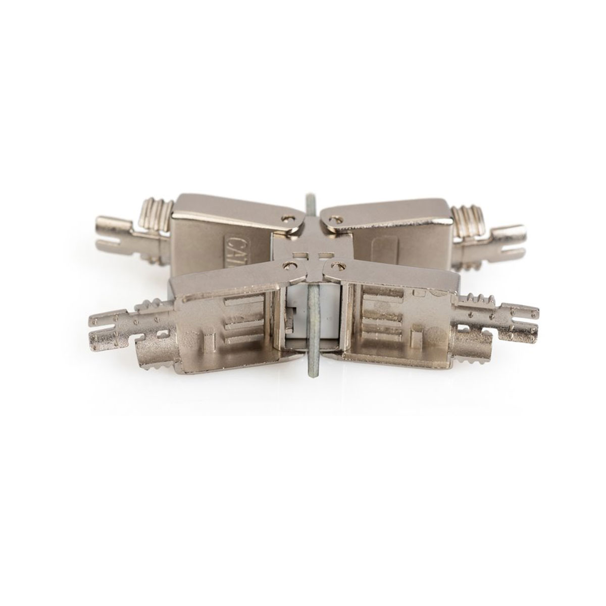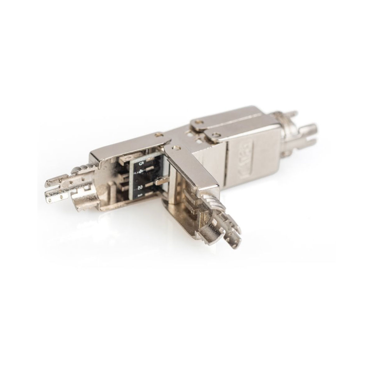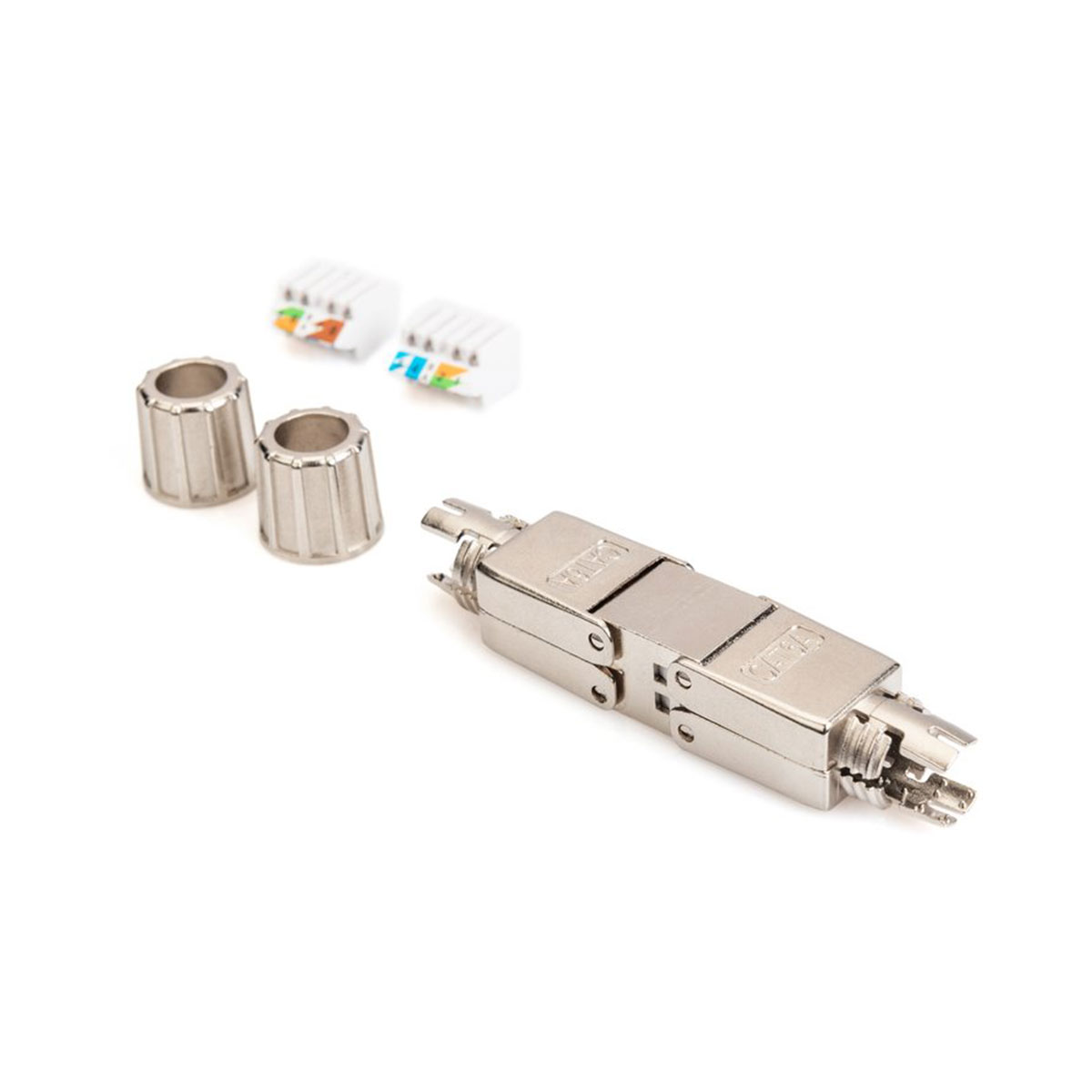 CB06-6A-MS is a silver, toolless, self-tapping, shielded coupler from the manufacturer Masterlan for field coupling applications of two shielded cables Cat. 6A 1 to 1. The coupler contains 2 x insulation-piercing contacts and due to its tool-free mounting connection does not require any tools to connect the cables.