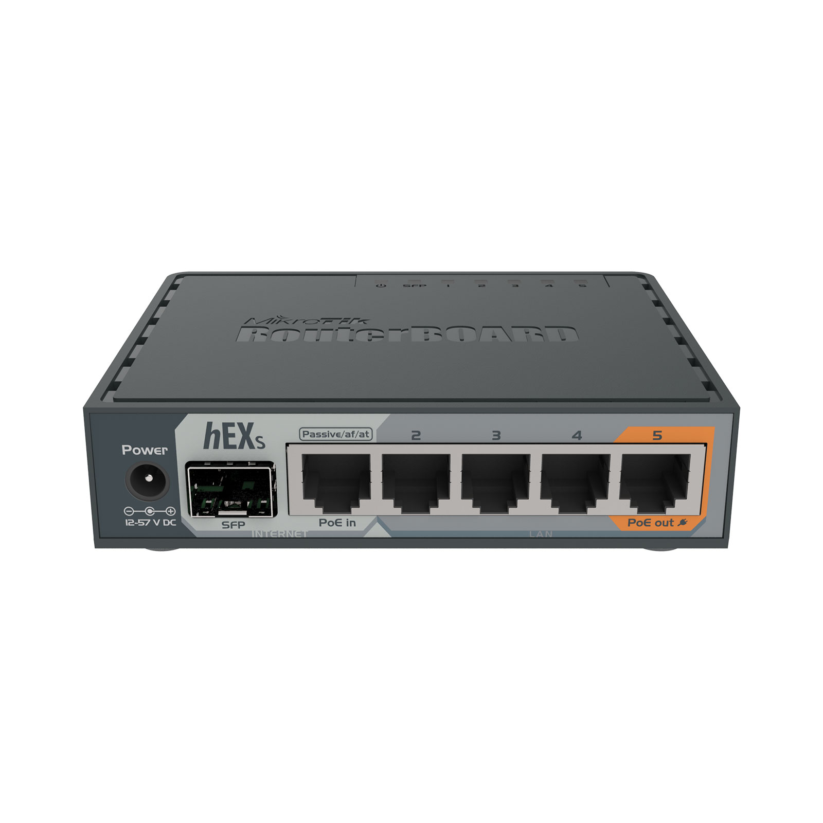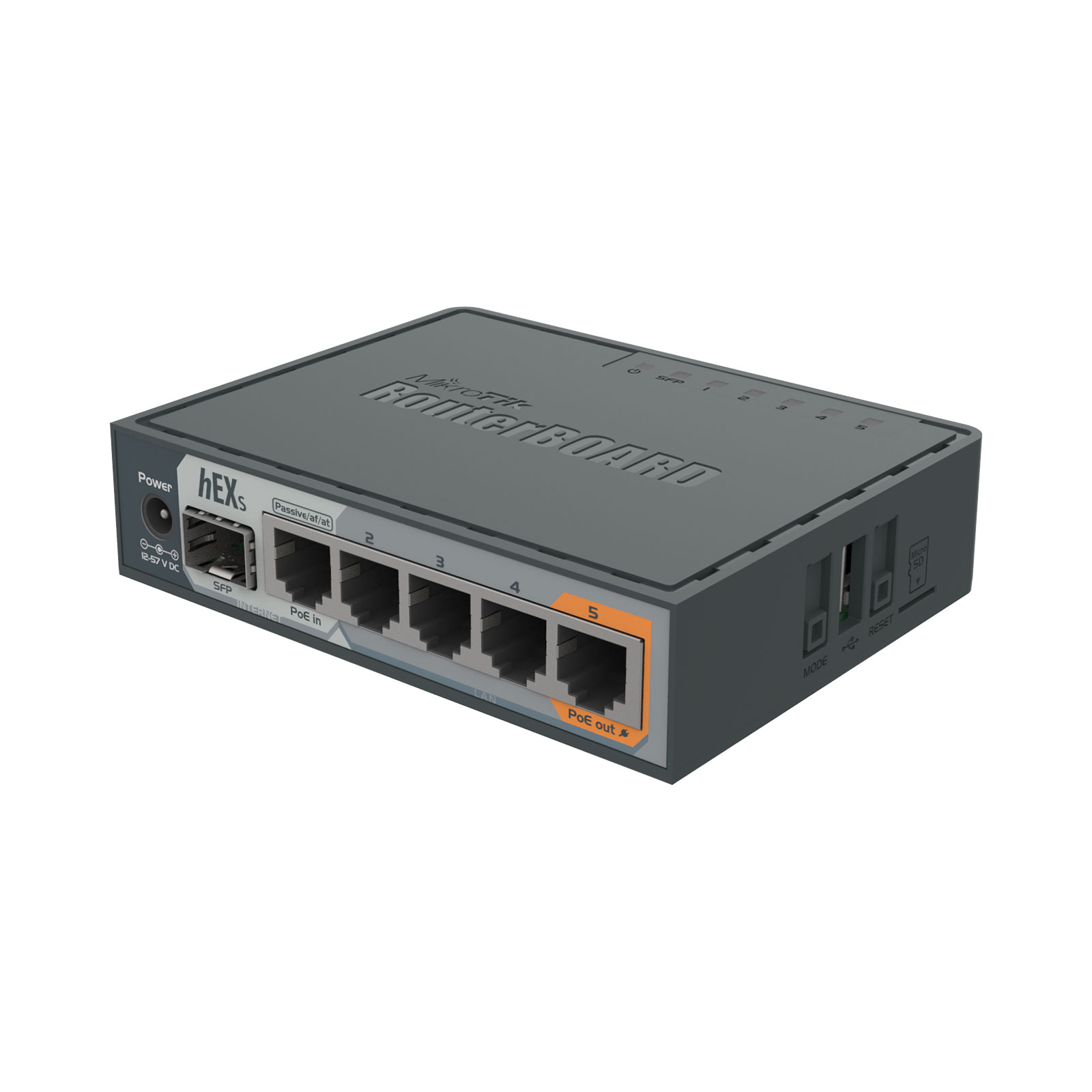 hEX S is a five port Gigabit Ethernet router for locations where wireless connectivity is not required. Compared to the hEX, the hEX S also features an SFP port and PoE output on the last port.