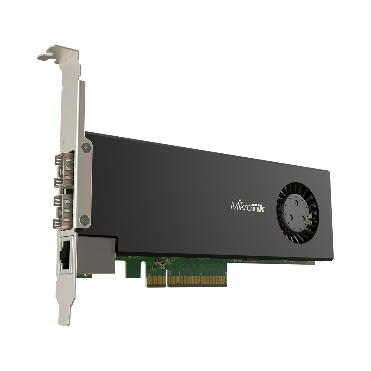 Cloud Core Router 2004-1G-2XS-PCIe network interface card with quad-core ARMv8 64-bit AL32400 CPU, 4GB RAM, 2x25G SFP28 cages, 1xGbit LAN, RouterOS L6. The smart and easy way to create 25 Gigabit networks if you want to save space in your server room. Save space in your server room by adding a real CCR2004 within the server itself!