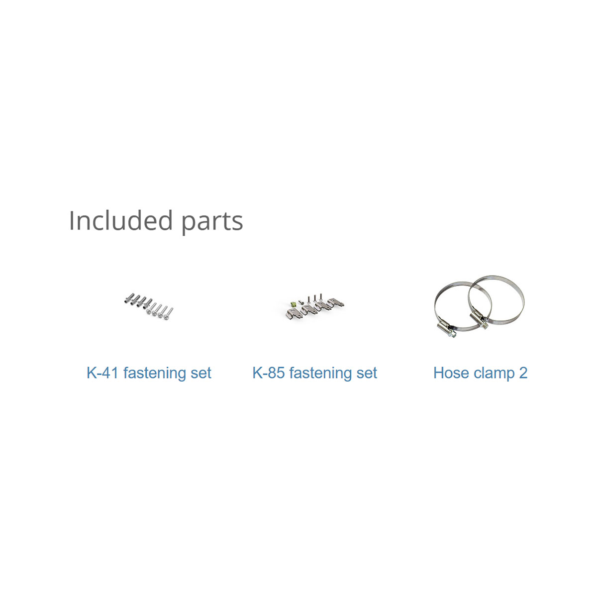 Package contains | • Hose clamp • Fastening set • Screw set |