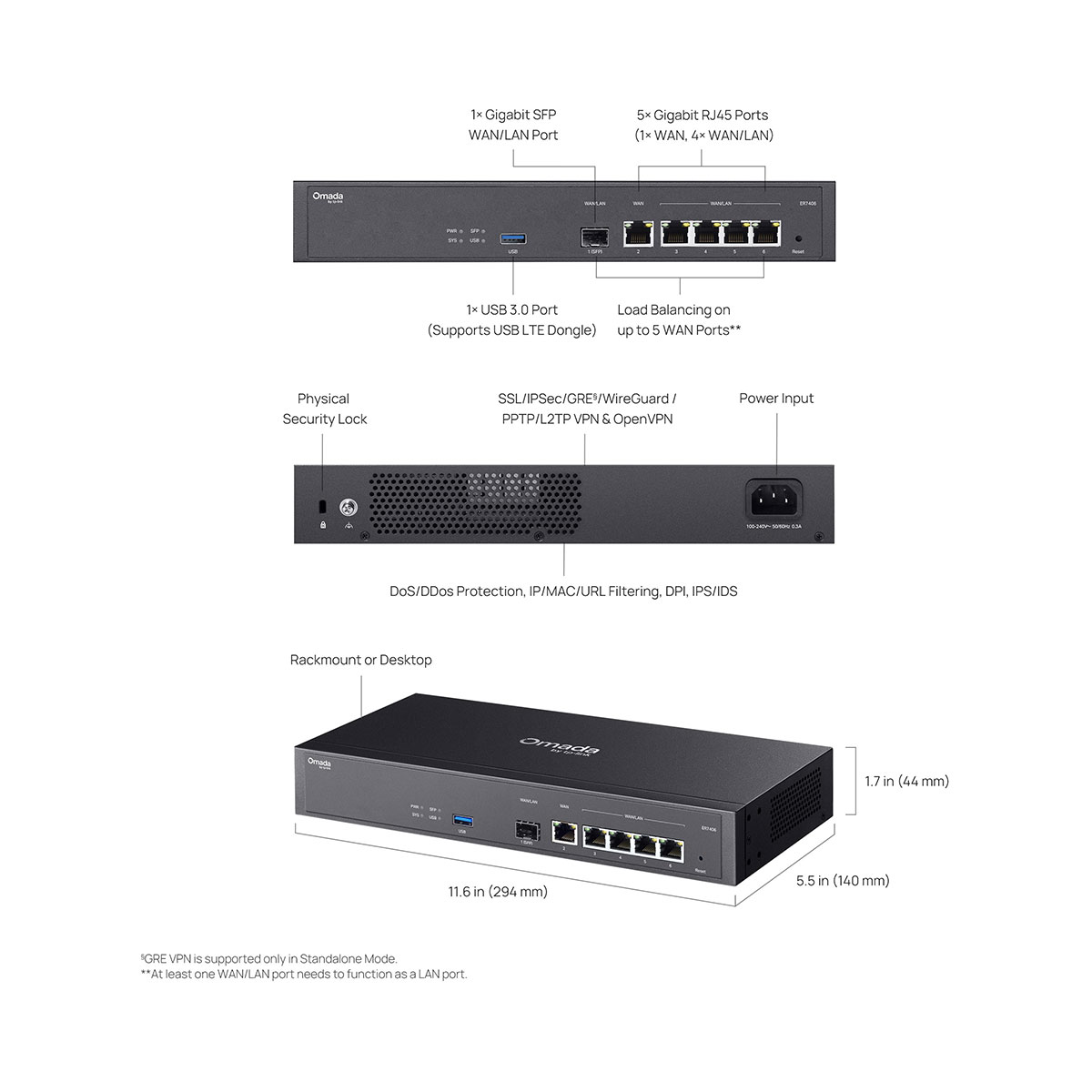 | • 1× Gigabit SFP WAN/LAN port • 5× Gigabit RJ45 ports (1× WAN, 4× WAN/LAN) • 1× USB 3.0 port (Supports USB storage, and LTE backup with LTE dongle) • Load Balancing on up to 5 WAN ports raises the utilization rate of multi-line broadband • High-security SSL/ IPSec / GRE§ / WireGuard / PPTP / L2TP VPN & OpenVPN • Centralized cloud management via the web or the Omada app* • DoS/DDoS protection, IP/MAC/URL filtering, DPI, and IPS/IDS for enhanced security. • Rackmount/Desktop |