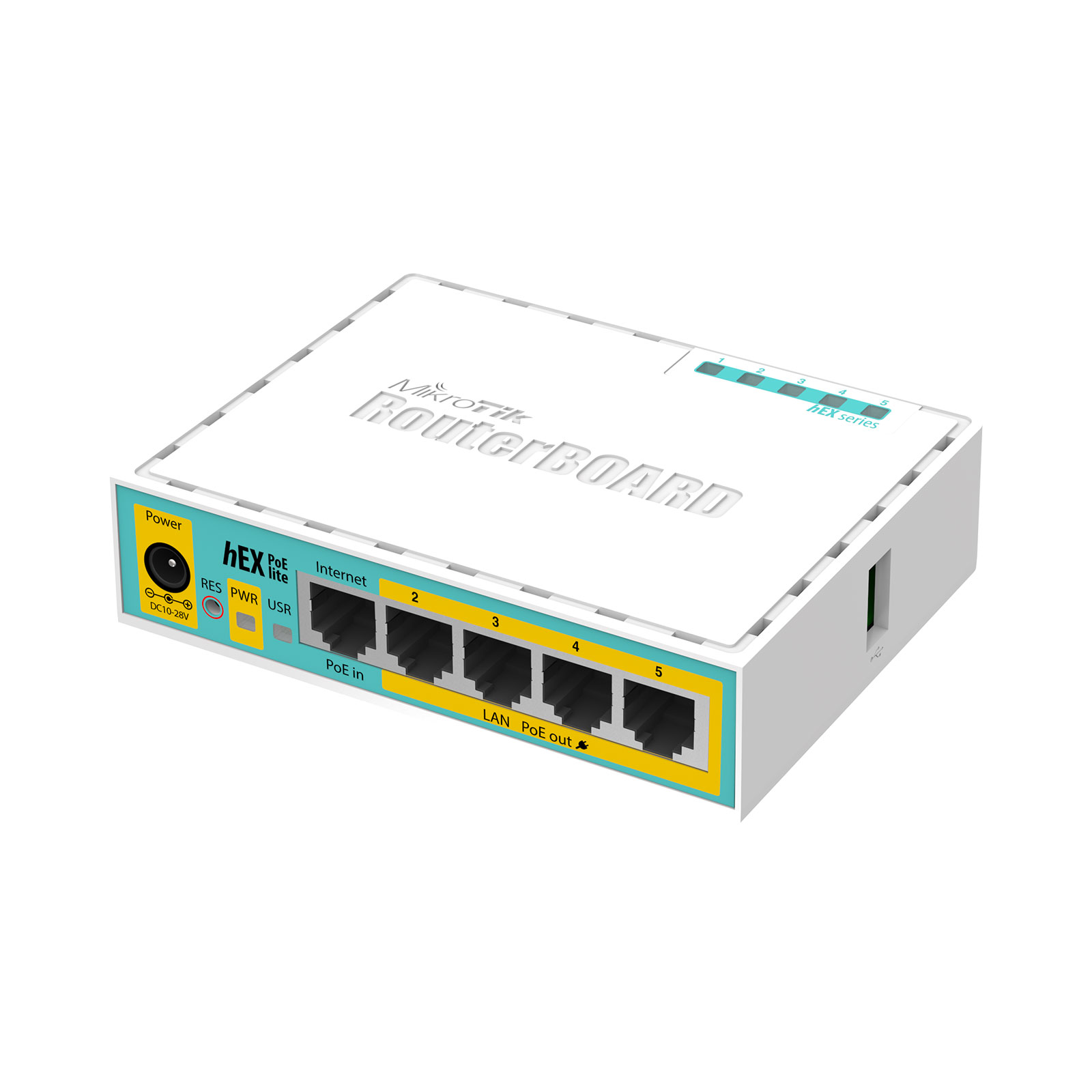 hEX PoE lite is a small five port ethernet router in a plastic case, it has a USB 2.0 port and PoE output.