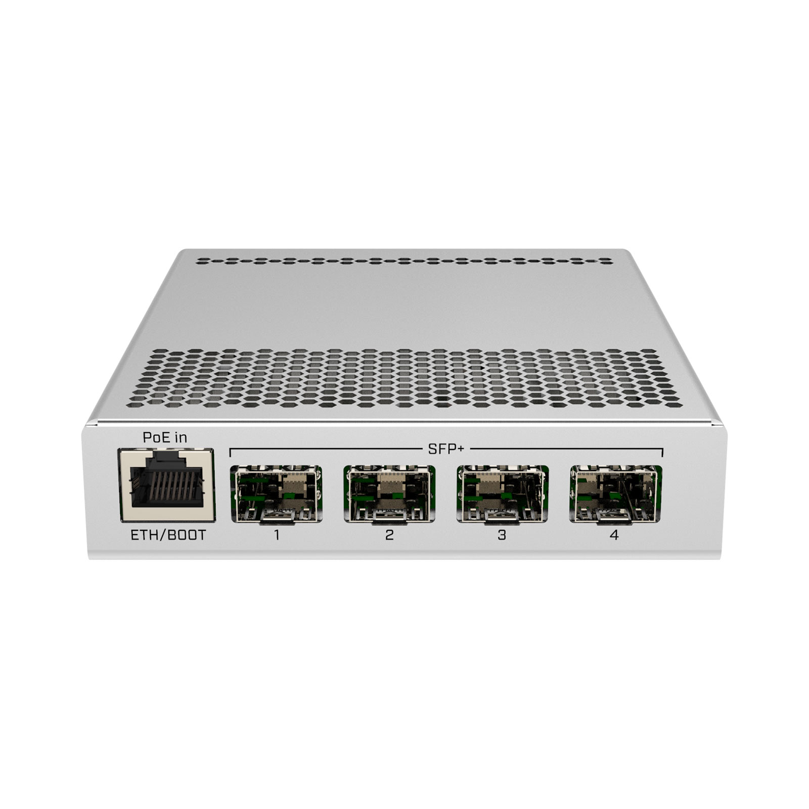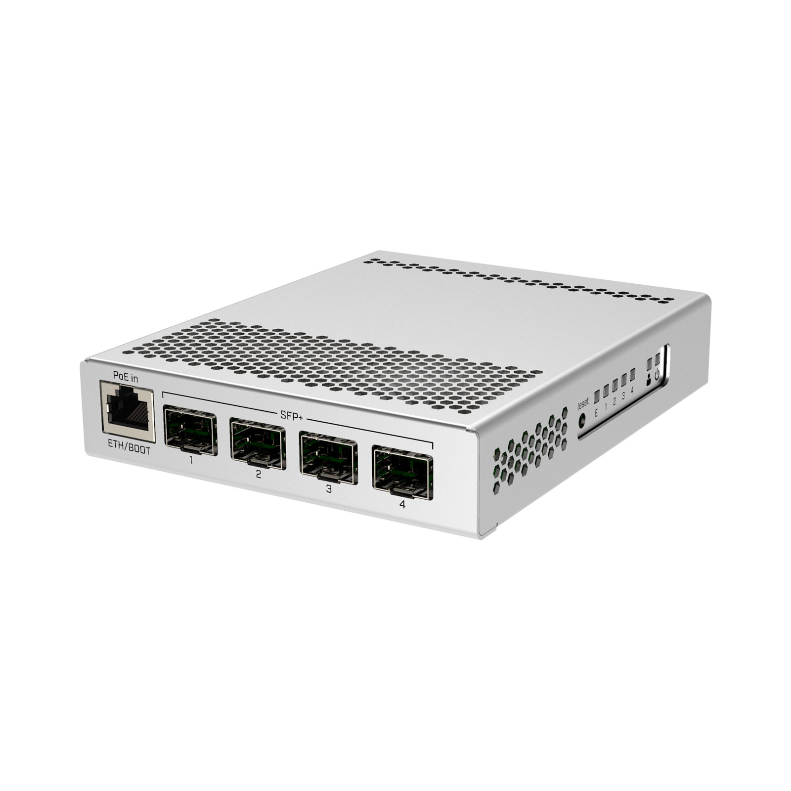 The CRS305 is a compact yet very powerful switch, featuring four SFP+ ports, for up to 10 Gbit per port. The device has a 1 Gbit copper ethernet port for management access and two DC jacks for power redundancy. The device is a very sleek and compact metallic case without any fans, for silent operation.