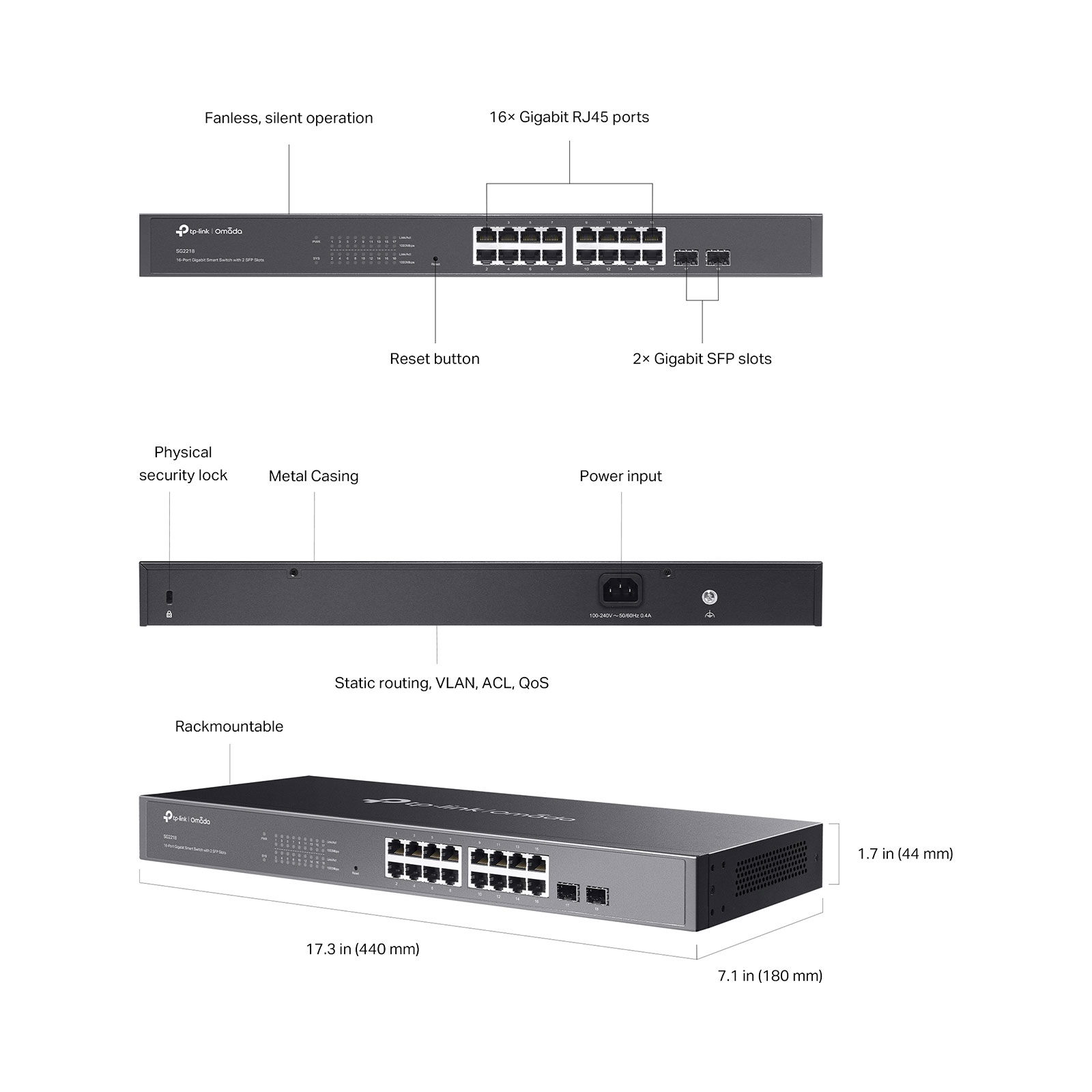 | • Full Gigabit Ports: 16x gigabit RJ45 ports and 2x gigabit SFP Slots provide high-speed connections. • Integrated into Omada SDN: Zero-Touch Provisioning (ZTP)*, Centralized Cloud Management, and Intelligent Monitoring. • Centralized Management: Cloud access and Omada app for ultra convenience and easy management. • Static Routing: Helps route internal traffic for more efficient use of network resources. • Robust Security Strategies: IP-MAC-Port Binding, ACL, Port Security, DoS Defend, Storm control, DHCP Snooping, 802.1X, Radius Authentication, and more. • Optimize Voice and Video Applications: L2/L3/L4 QoS and IGMP snooping. • Standalone Management: Web, CLI (Telnet, SSH), SNMP, RMON, and Dual Image bring powerful management capabilities |