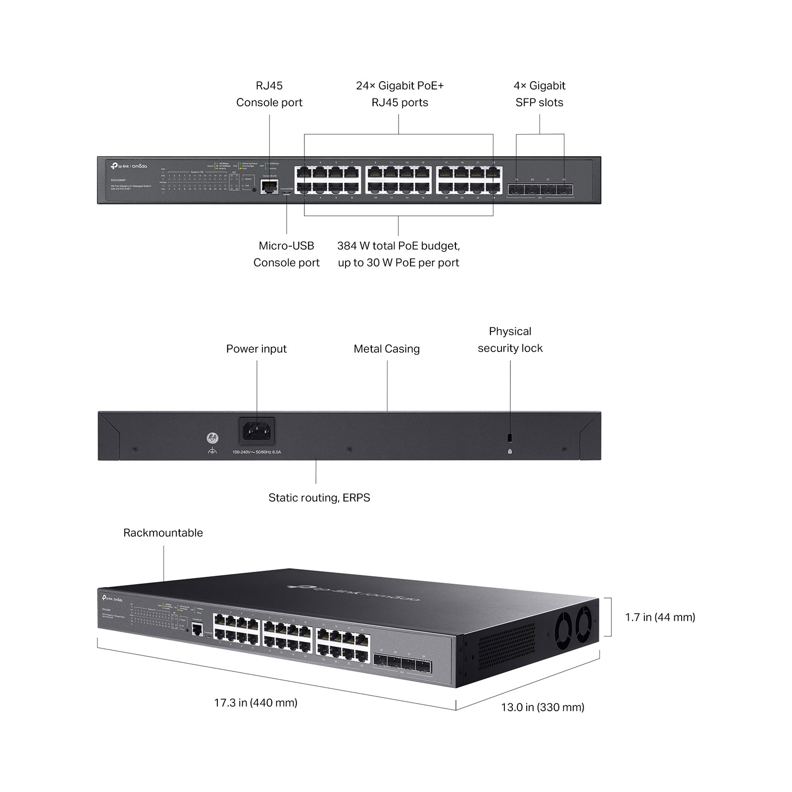 | • 24× Gigabit 802.3af/at PoE+ ports and 4× Gigabit SFP slots • 384 W total PoE budget with up to 30 W PoE output per port* • Centralized cloud management via the web or the Omada app† • Standalone management via web, CLI, SNMP, and RMON • Static Routing helps route internal traffic for higher efficiency • VLAN, ACL, QoS, IGMP Snooping, OAM, and DDM • ERPS supports rapid protection and recovery in a ring topology • Durable metal casing and rack-mountable design |
