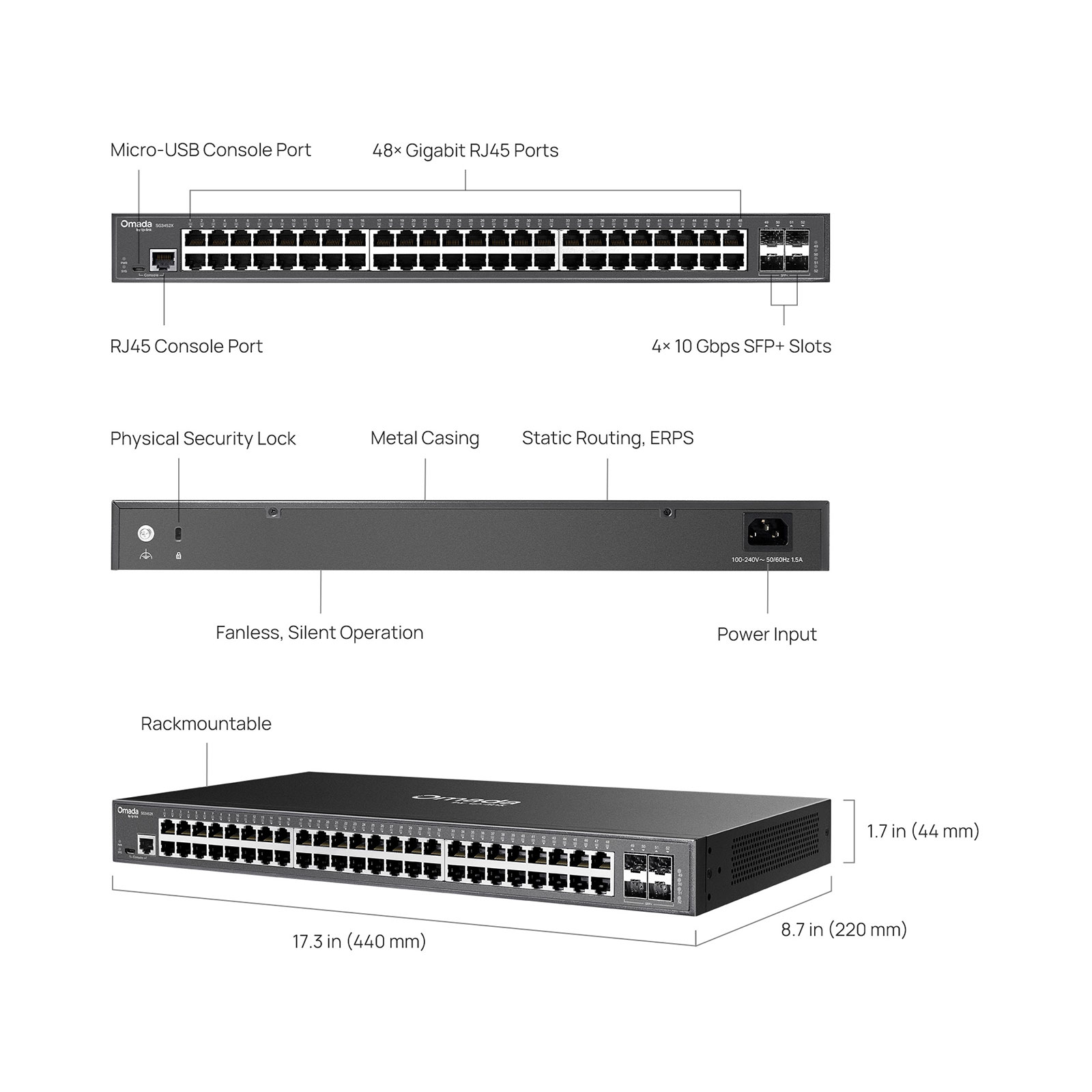| • 10G Lightning-Fast Uplink: 4× 10 Gbps SFP+ slots enable high-bandwidth connectivity and non-blocking switching capacity. • Gigabit Speeds: 48x gigabit RJ45 ports offer high-speed and reliable connections to other switches and devices. • Integrated into Omada SDN: Zero-Touch Provisioning (ZTP)*, Centralized Cloud Management, and Intelligent Monitoring. • Centralized Management: Cloud access and Omada app for ultra convenience and easy management. • Static Routing: Helps route internal traffic for more efficient use of network resources. • Robust Security Strategies: IP-MAC-Port Binding, ACL, Port Security, DoS Defend, Storm control, DHCP Snooping, 802.1X, Radius Authentication, and more. • Optimize Voice and Video Applications: L2/L3/L4 QoS and IGMP snooping. • Standalone Management: Web, CLI (Console Port, Telnet, SSH), SNMP, RMON, and Dual Image bring powerful management capabilities. |