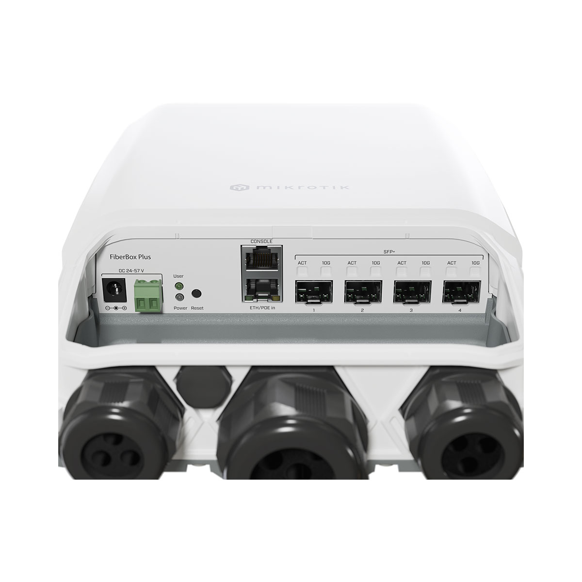 There are two ways to look at the brand new Fiber Box Plus. On the one hand, it’s a massive upgrade of our previous FiberBox devices. This version features a modern ARM CPU, more RAM, and four 10-Gigabit SFP+ ports. Fast and reliable connectivity on a budget. Without the distance limitations of Ethernet. There’s also a Gigabit Ethernet port for management purposes or PoE-in powering. MikroTik has also included a 2-pin terminal and a standard DC jack, so you have 3 different power options to choose from. FiberBox Plus supports a wide input voltage range of 24-57V. And it is remarkably efficient: maximum power consumption (without attachments) is only 7W.