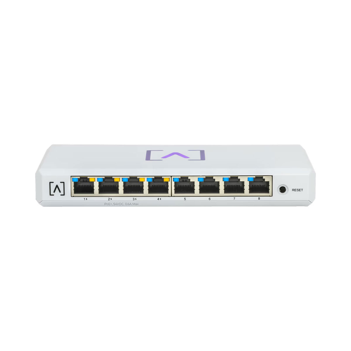 The S8-PoE is a compact switch with eight 10/100/1000 ports, four of which support PoE+. It can be placed on a desktop or mounted on a wall. All of the Alta Labs switches include Bluetooth functionality for seamless device setup