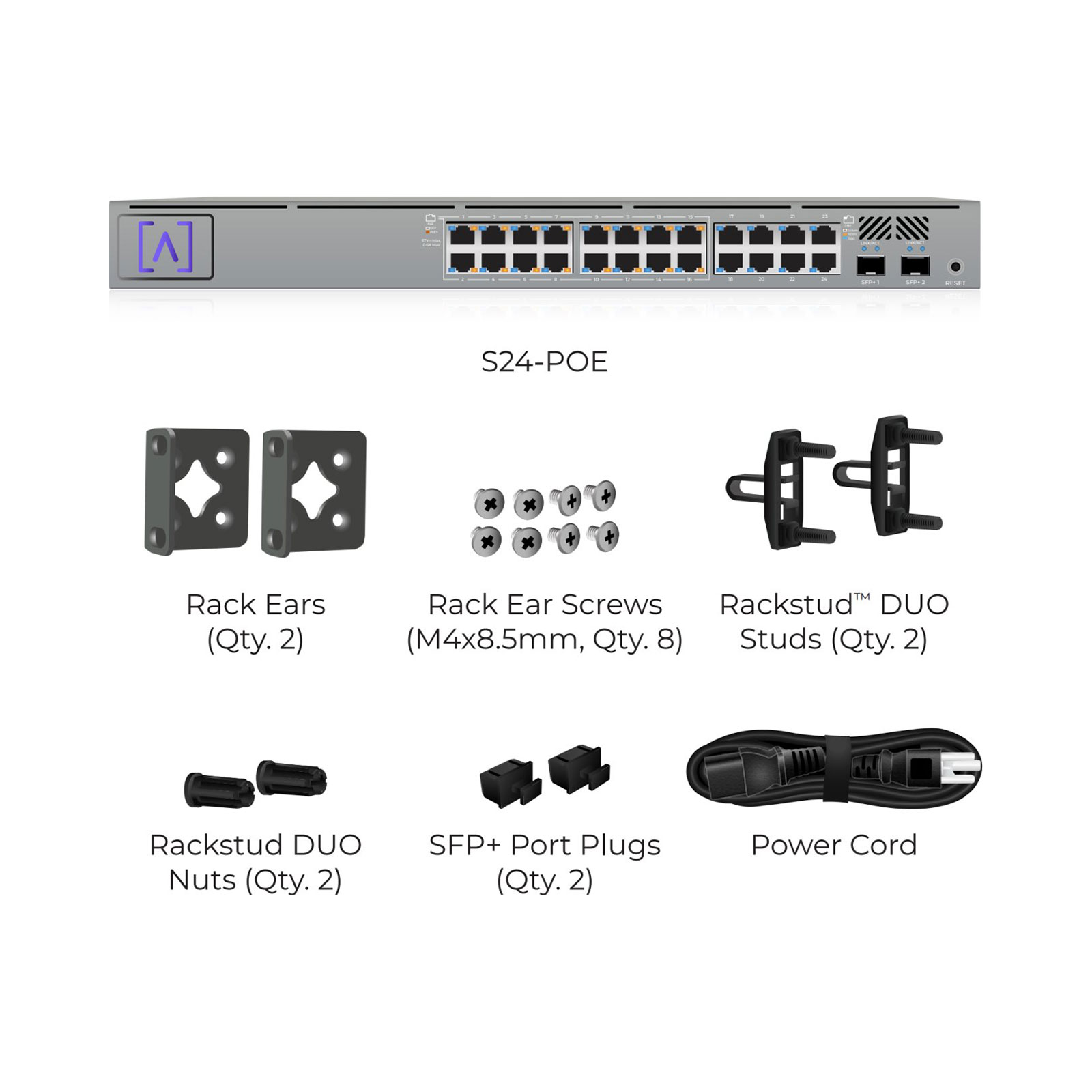 The S24‑PoE switch provides two SFP+ ports for high‑capacity fiber or copper connections of 1 Gbps, 2.5 Gbps, 5 Gbps, or 10 Gbps.