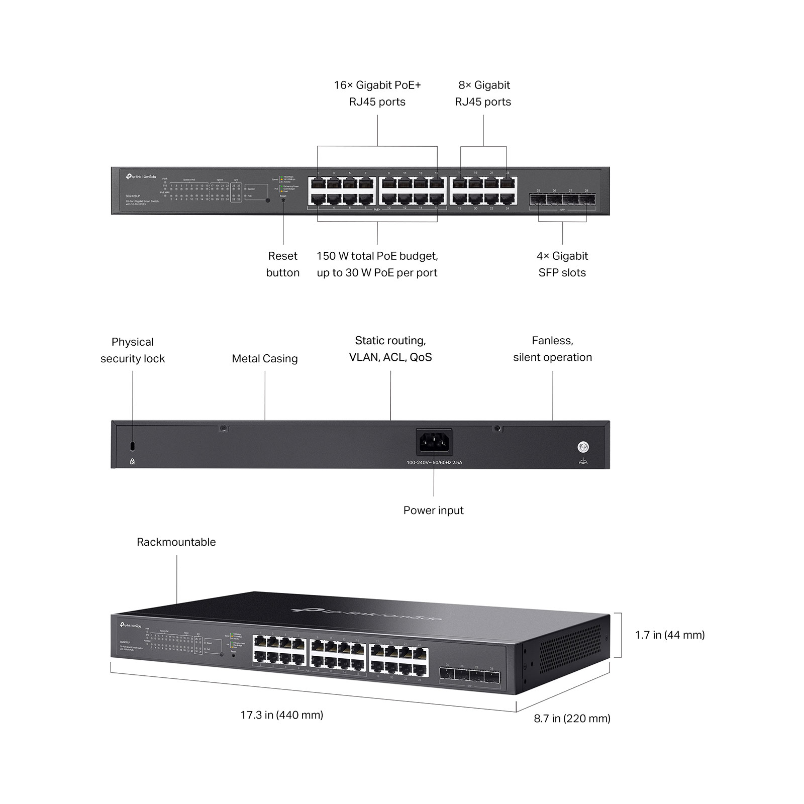 | • 16× Gigabit 802.3af/at PoE+ ports • 8× Gigabit non-PoE RJ45 ports and 4× Gigabit SFP slots • 150 W total PoE budget with up to 30 W PoE output per port* • Centralized cloud management via the web or the Omada app† • Standalone management via web, CLI, SNMP, and RMON • Static Routing helps route internal traffic for higher efficiency • VLAN, ACL, QoS, and IGMP Snooping • Fanless design for quiet operation • Durable metal casing and rackmountable design |