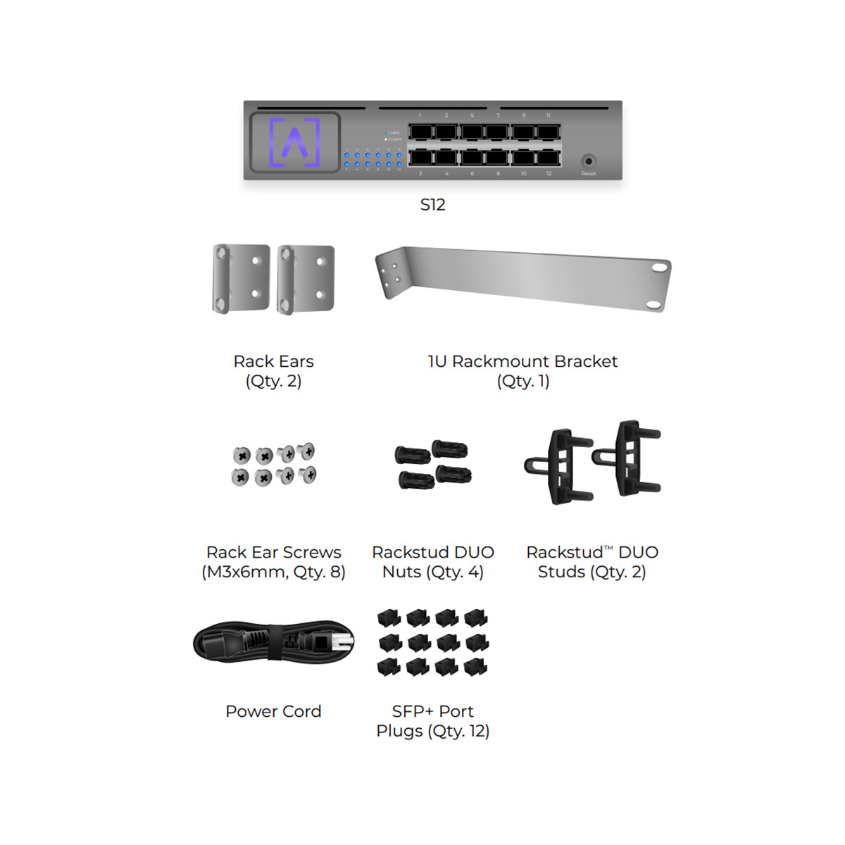 The Switch S12 from Alta Labs offers top-notch performance and versatile use in environments where fast and reliable connectivity is required. It features 12 SFP+ ports with speeds of up to 10 Gbps, ensuring stable connections in campuses, hotels, restaurants, resorts, entertainment centers, or residential complexes. Thanks to its fully manageable design, it provides advanced features such as VLAN stacking, IGMP snooping, 802.1X authentication, or loop detection. Spatial flexibility is ensured by mounting accessories – the switch can be installed on a wall or in a rack, while an optional adapter allows two S12 units to fit into a single 1U position.