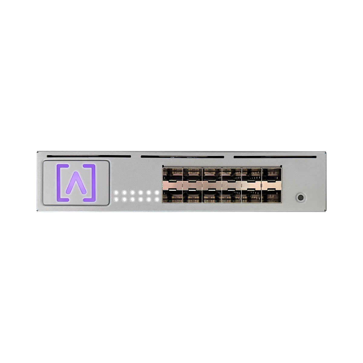 The S12 12-Port Distribution Switch provides twelve SFP+ ports for high capacity fiber or copper connections of 1 Gbps, 2.5 Gbps, 5 Gbps, or 10 Gbps.