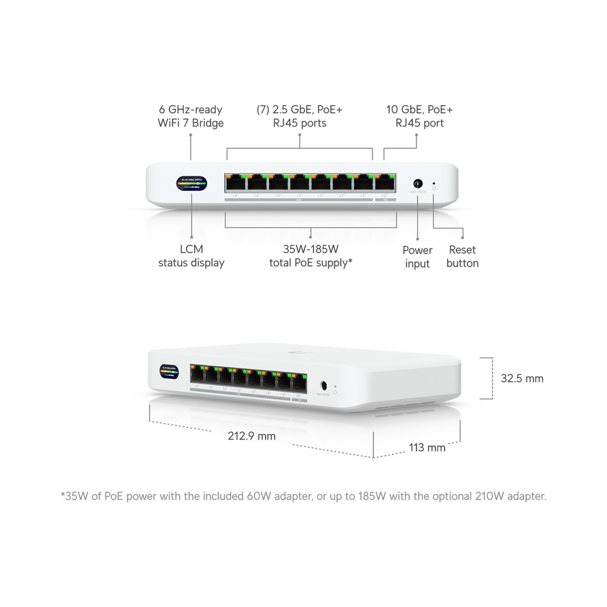 - Total PoE power of 35 W (60W adapter) or up to 185 W (optional 210W adapter).