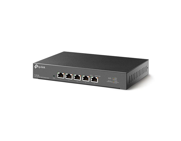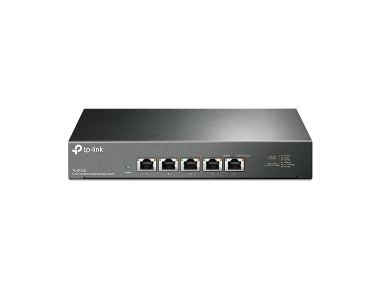 As the flagship 10G product, TL-SX105 is a 5-port 10G desktop switch, providing up to 100 Gbps of switching capacity. Auto-negotiation 5-speed (100Mbps/1G/2.5G/5G/10G) connections sense the link speeds and intelligently adjust for compatibility and optimal performance for all your devices, including 10G NAS, 10G server, workstation, gaming computer, 2.5G/5G/10G WiFi 6 AP, 8K video, desktop, and more.