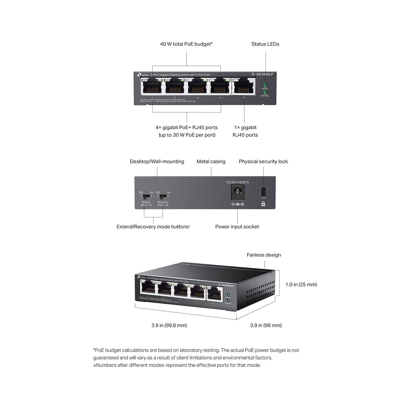 *PoE budget calculations are based on laboratory testing. Actual PoE power budget is not guaranteed and will vary as a result of client limitations and environmental factors.