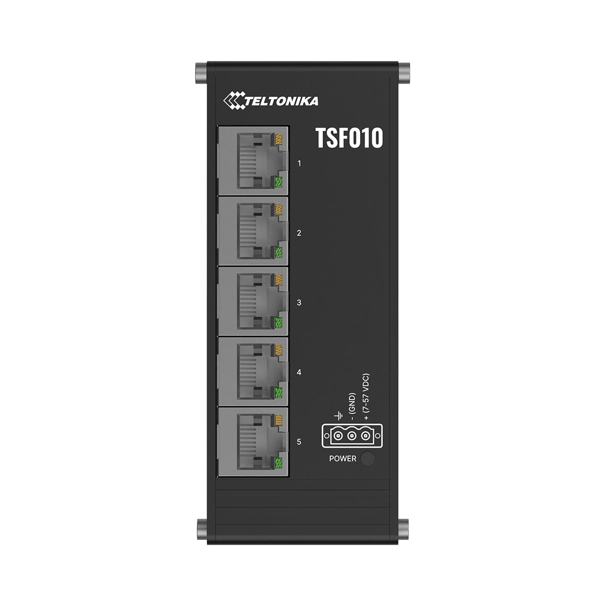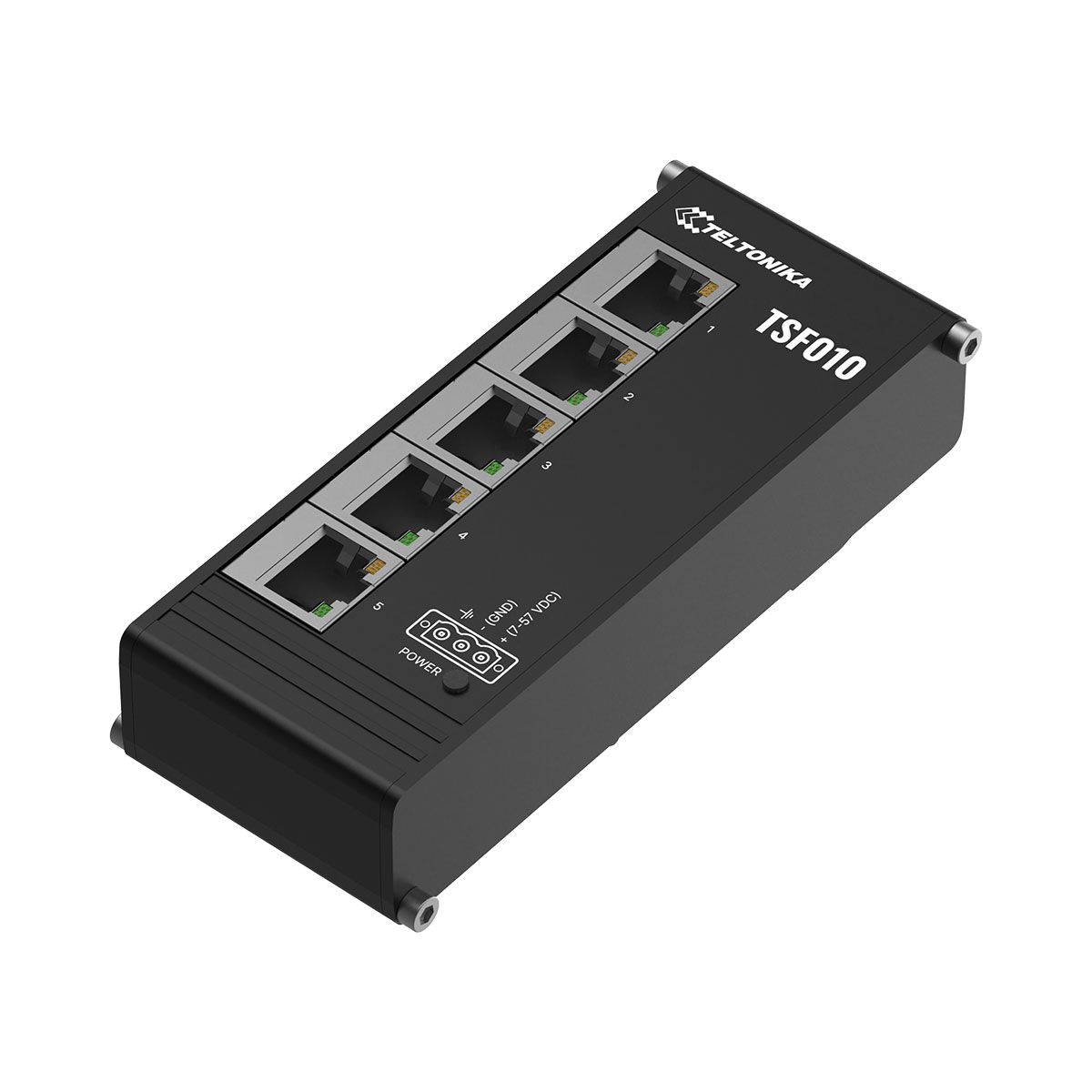 The TSF010 is an unmanaged Ethernet switch featuring a flat design and integrated DIN rail mounting for plug-and-play deployment in industrial cabinet applications. This Ethernet switch is compact and lightweight, measuring 113 x 28 x 50 mm and weighing only 142 g. Its 3-pin power input and 7-57 VDC voltage range make it a flexible unmanaged switch tailor-made for industrial use. The TSF010 is equipped with five 10/100 Mbps RJ45 ports for reliable connectivity.