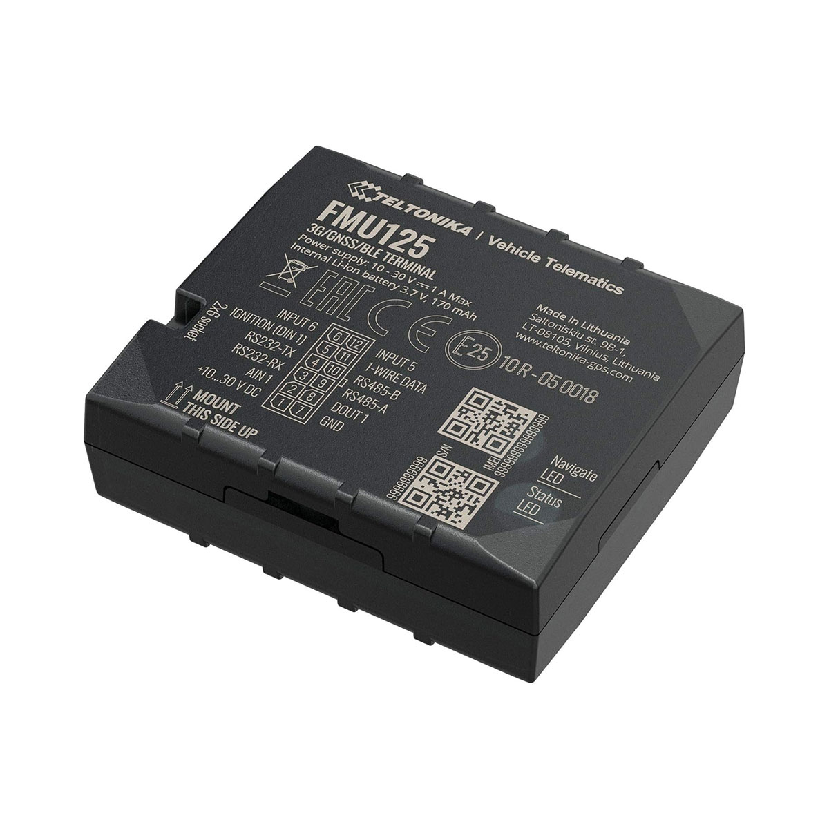 FMU125 is small and professional real-time tracking terminal with GNSS and 3G/GSM connectivity and backup battery. Device equipped with GNSS/Bluetooth and 3G modules, internal GNSS, 3G antennas. FMU125 features RS485/RS232 data interface, which gives ability to connect various third-party external devices. It is perfectly suitable for applications where location acquirement of remote objects is needed: fleet management, car rental companies, taxi companies, public transport, logistics companies, personal cars and so on.
