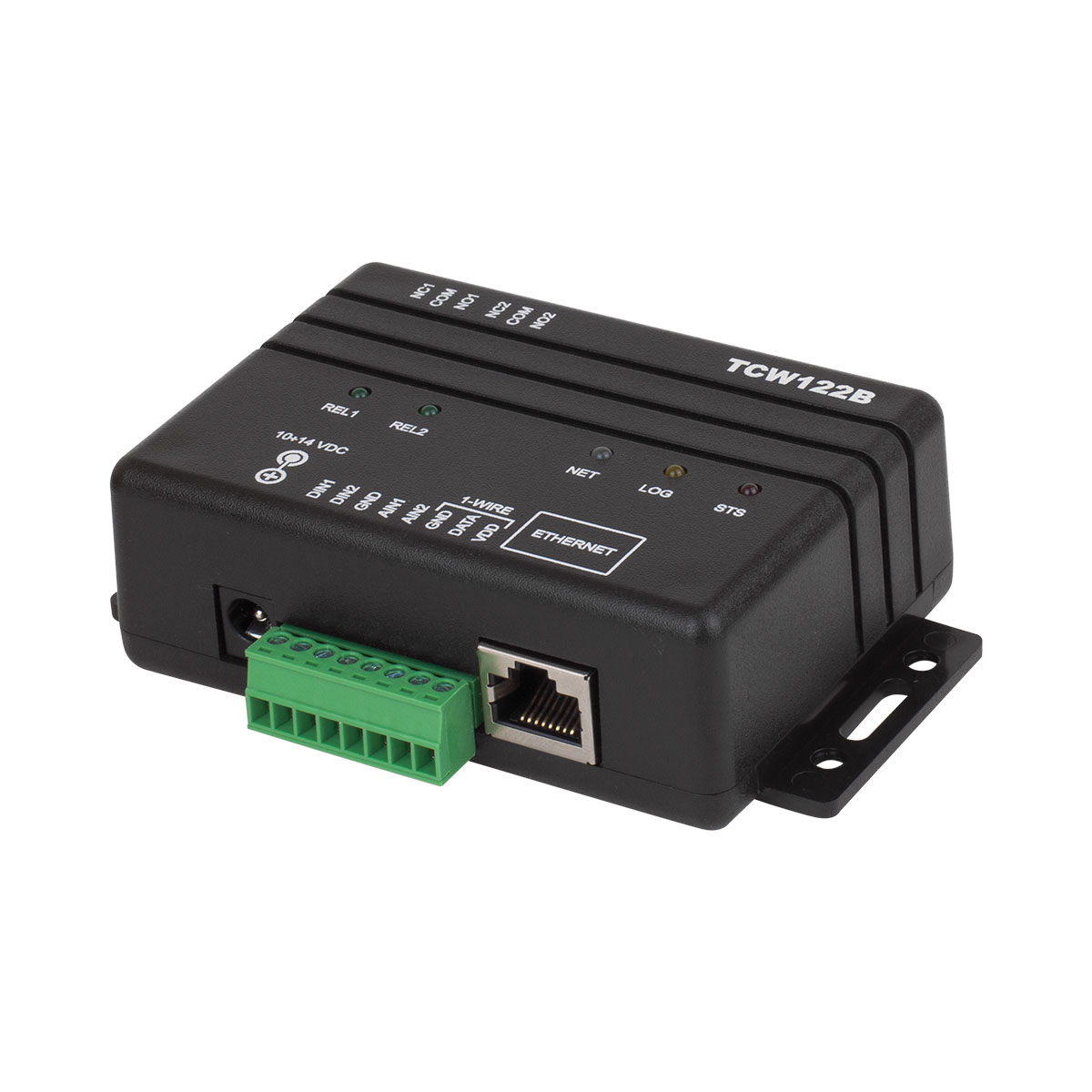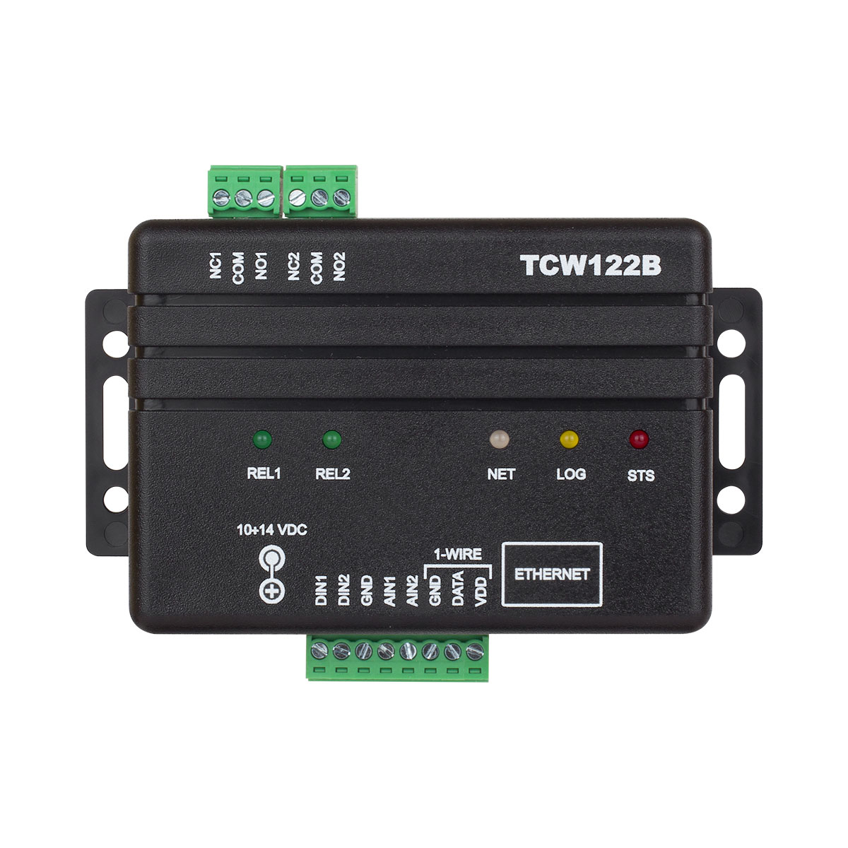 TCW122B-CM is a remote IO module for environmental monitoring and control, designed to work in Ethernet networks. It can be managed by WEB interface, SNMP programs, and user applications.