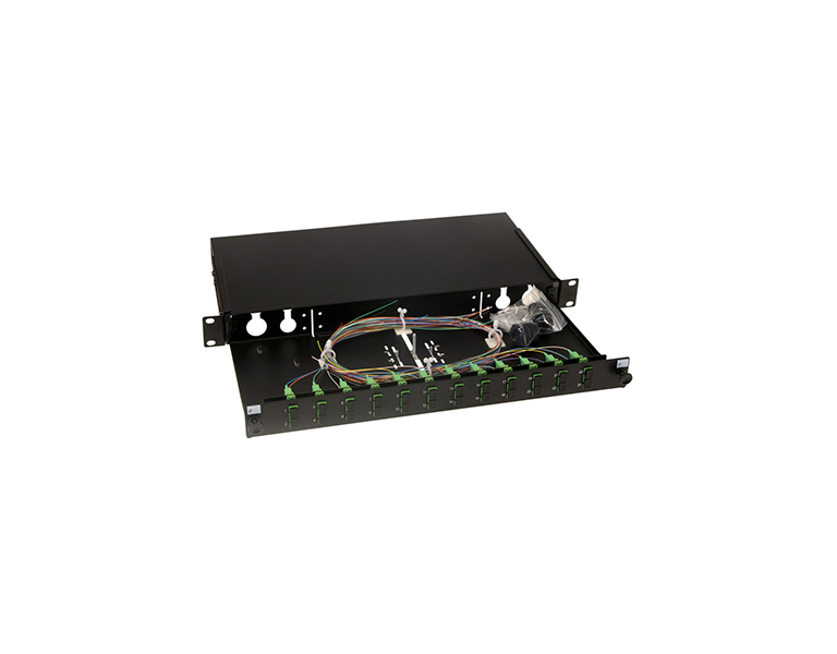 Optical fiber distribution with a height of 1U to a 19" rack in black is equipped with 12 SC APC duplex optical couplers. The tray includes, in addition to connectors also a weld protection cassette, 24 pigtails, splice protection and cable glands.