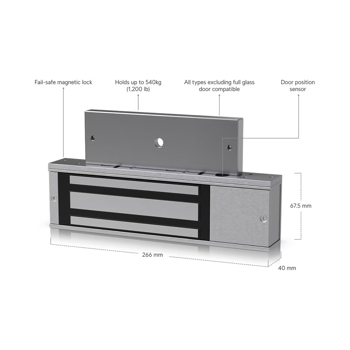 The UniFi Access Lock Magnetic is a fail-secure magnetic lock that connects to the UniFi Access Hub (UA-Hub) of a device containing terminals for power Lock Relay (COM and NC) and input control DPS (+ and -). The lock ensures the safety of the door with a resistance of up to 540 kg. Can be installed on wooden, iron or glass doors. For optimal security and an integrated access system, combine the UniFi Access Lock Magnetic with the UniFi Access Hub and enjoy simple management and control.