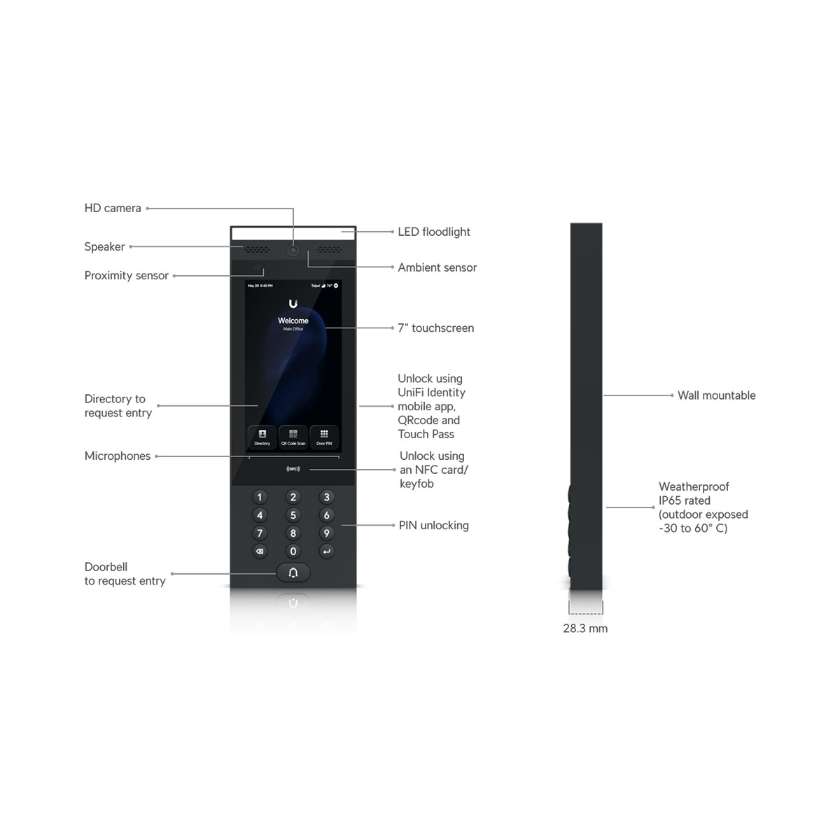 This stylish entry device features a 7" color touchscreen offering intuitive control and easy communication with the system. Thanks to the integrated 2Mpx camera and Mifare card reader, secure and convenient access is ensured. The backlit keypad, Bluetooth connectivity, and IP65 rating allow for use in outdoor environments. Powering via PoE simplifies installation, while the GbE network port ensures reliable operation in any UniFi Access system.