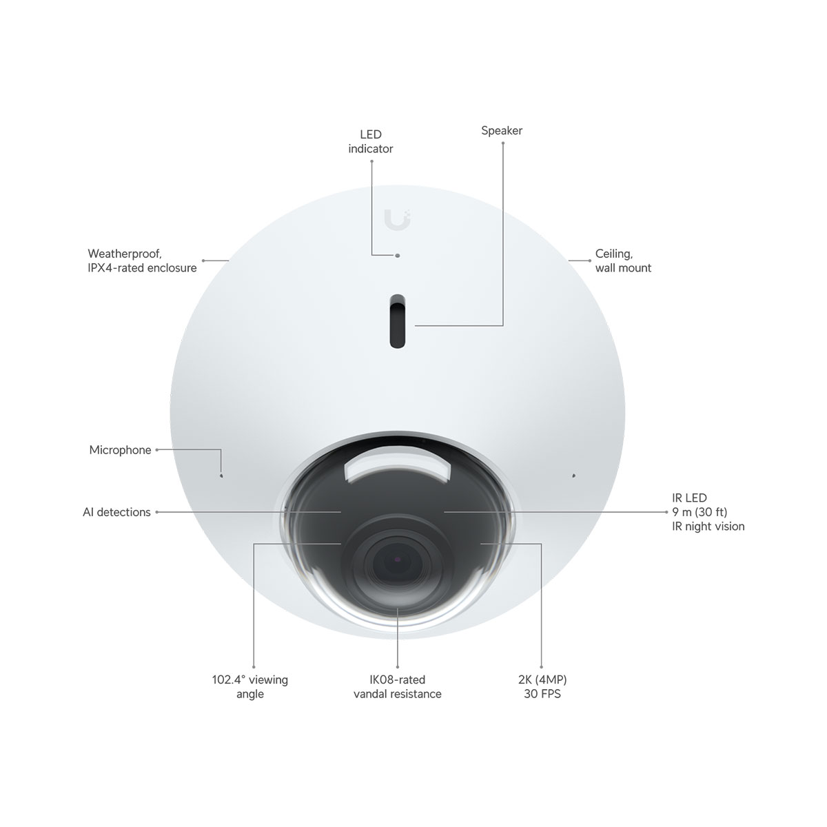 UniFi Protect G4 Dome security camera features 4 MP video performance, two-way audio, and a weather-resistant enclosure for discreet surveillance, indoors or outdoors. Infrared LEDs and an automatic IR cut filter allow for a day or night monitoring.