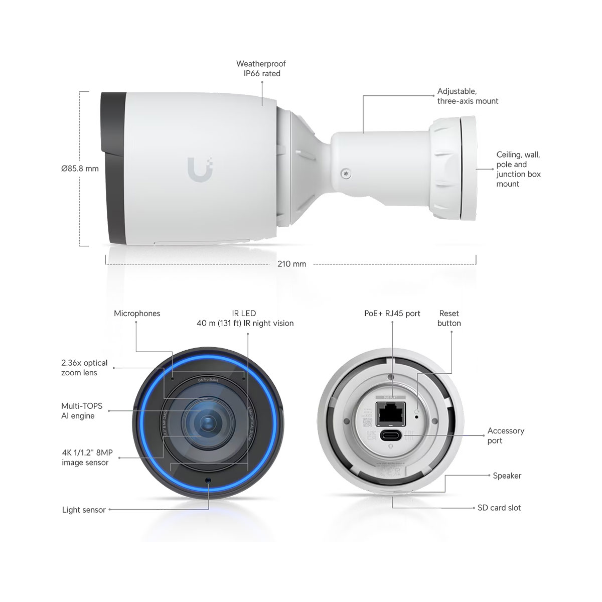 Ubiquiti UVC-G6-PRO-BULLET-W, 4K PοE+ IP Camera , 2.36X Optical Zoom, Long Range IR, White
