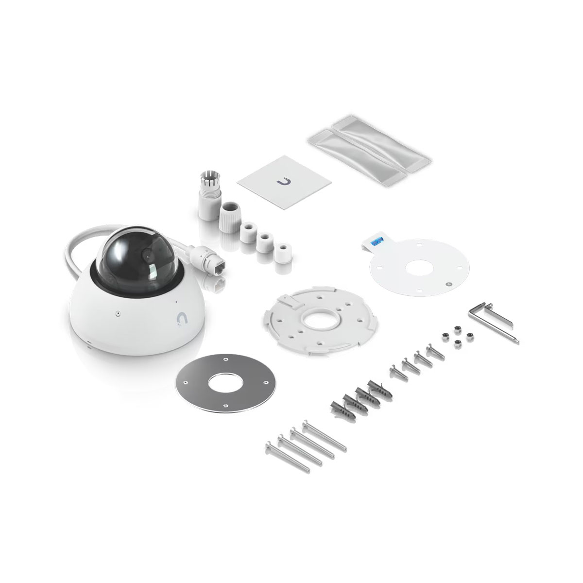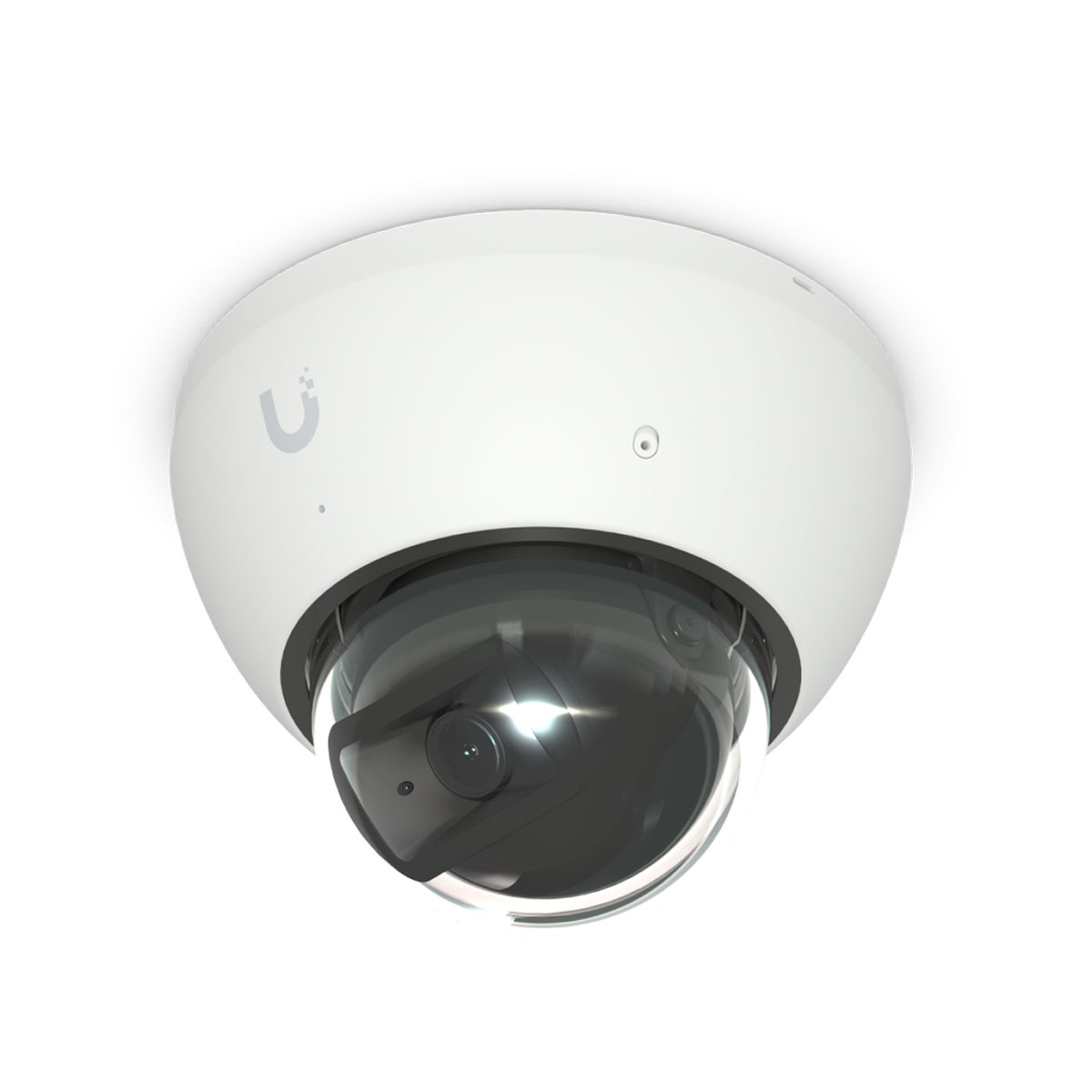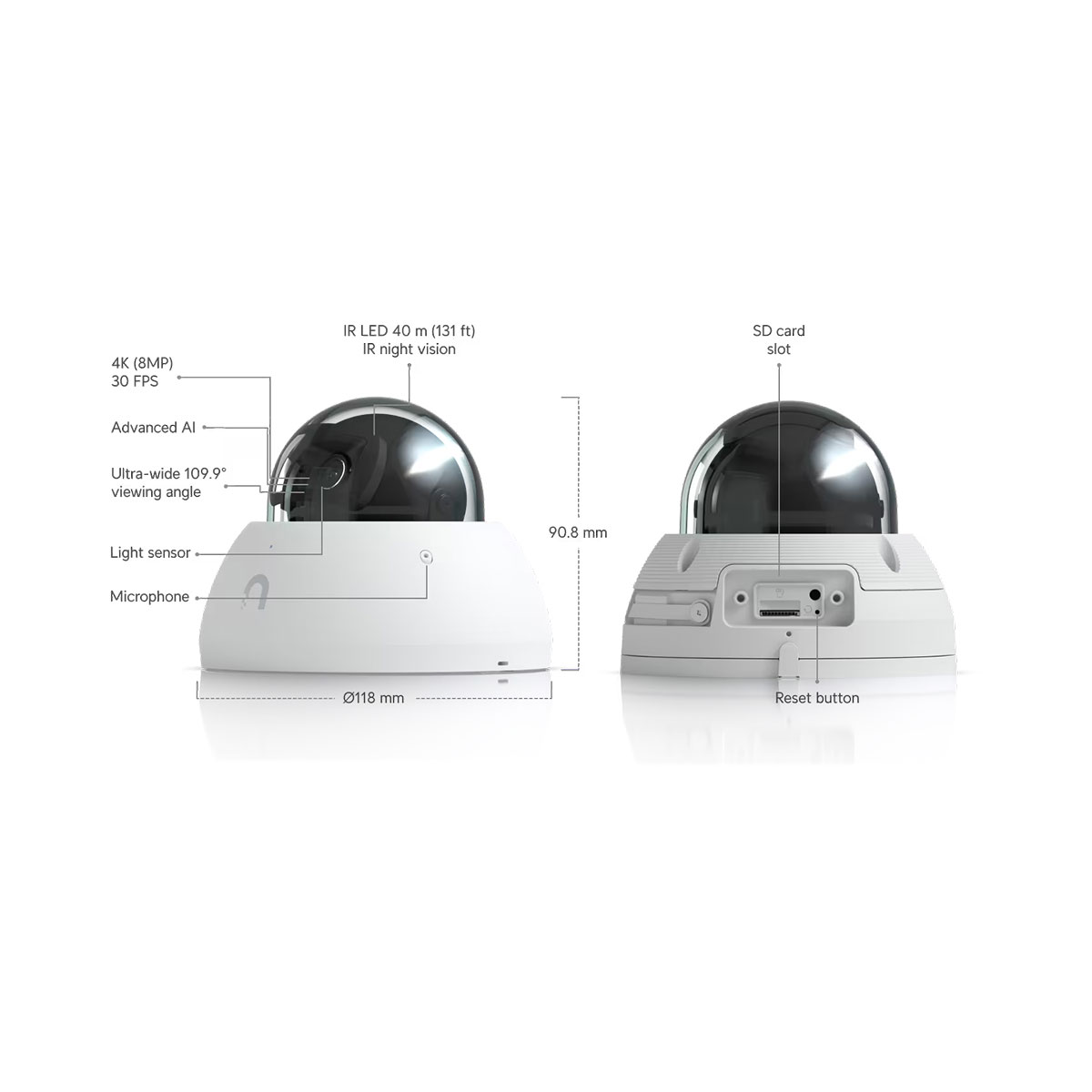 The UniFi Protect dome camera features a high-resolution 8 MP sensor (3840 x 2160 px) at 30 fps and a fixed lens of approximately 2.8 mm (inferred from the 110° field of view, not officially specified). It offers IR illumination for night vision up to 40 meters, microSD card slot (at least 64 GB), built-in microphone with an optional mute function, and smart AI capabilities, such as facial and license plate recognition. Its durable aluminum-polycarbonate housing ensures vandal resistance (IK10) and environmental protection (IP66). The camera connects via Gigabit LAN with PoE (42–57 V DC) support, consuming up to 10 W.
