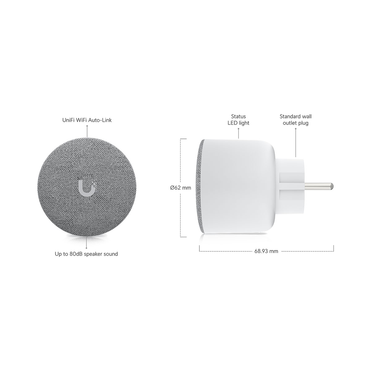 A WiFi connected chime that can be plugged into a standard wall outlet and paired with a UniFi Protect doorbell. This device is ideal for homes without a wired chime system or one that is incompatible with their Protect doorbell.