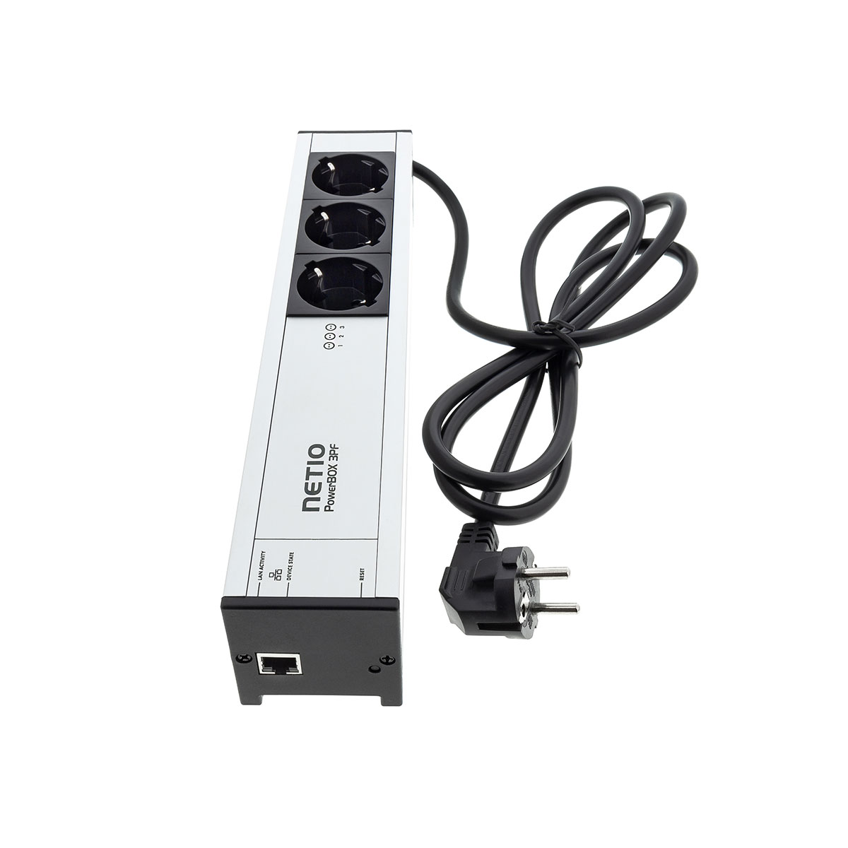 NETIO PowerBOX 3PF is a power socket device with 3 outputs controlled over a LAN. Each output can be switched off and on over the web, the NETIO cloud service, or with a mobile app.
