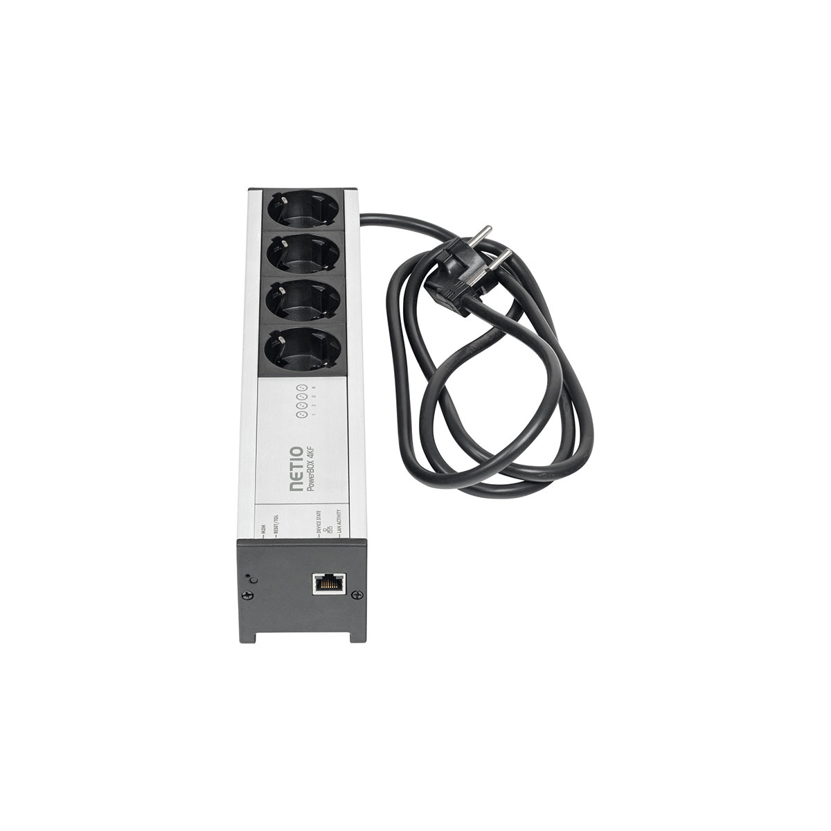 PowerBOX 4KF is a LAN controlled power strip with 4 outputs. Each output can be switched off and on over the web, NETIO cloud service, or with a mobile app.