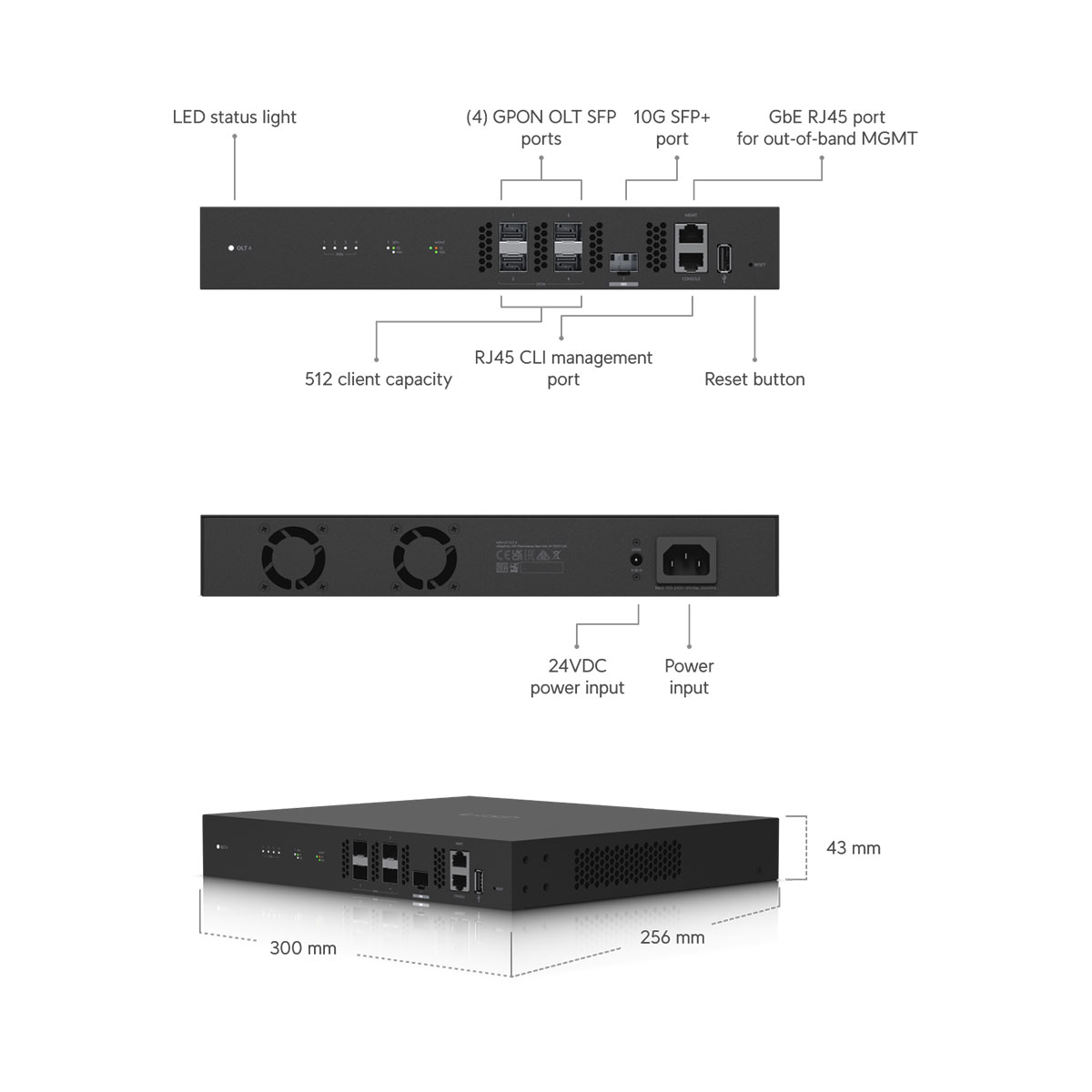 • Ports: (4) GPON SFP Ports, (1) SFP+ Port