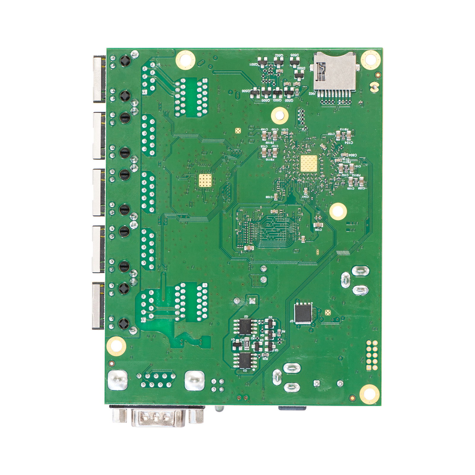 The RB450Gx4 is an Ethernet router with five Gigabit Ethernet ports, a serial port, 512 MB NAND memory and a microSD card slot. In addition, it supports full 10 V - 57 V input by two power jacks or PoE (802.3af/ at or passive PoE) and can provide PoE output for Ethernet port #5.