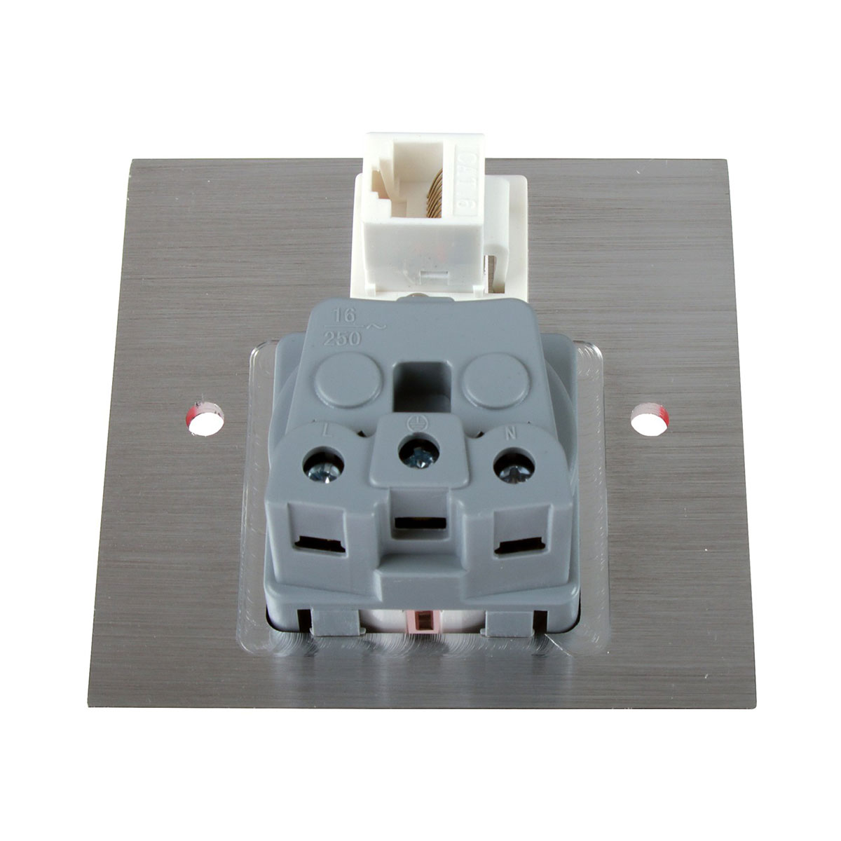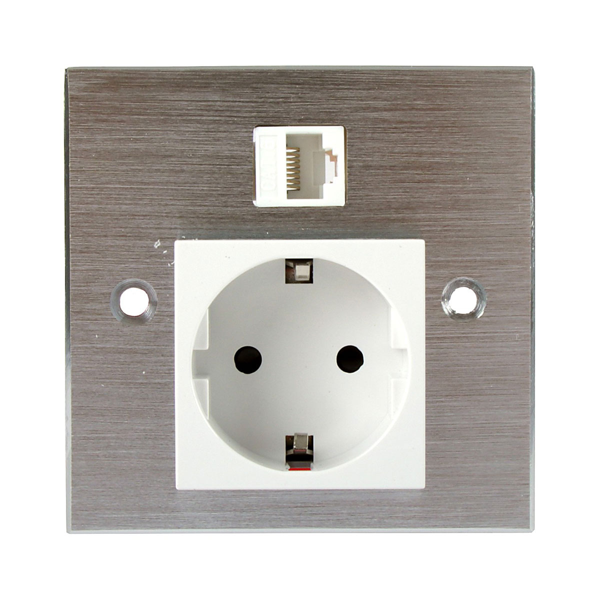The aluminum front panel features a Schuko electrical outlet and a RJ45 connector, both in white color.
