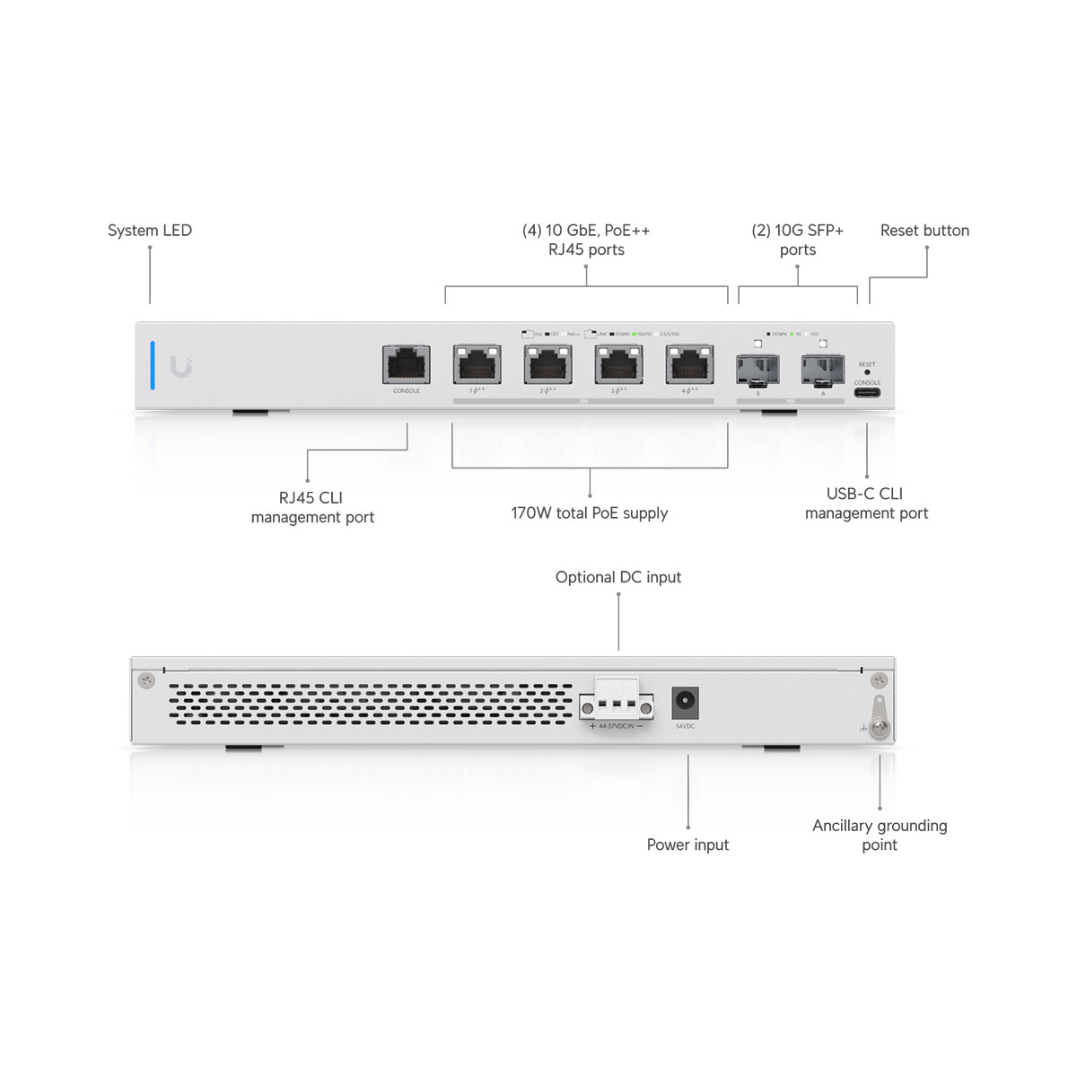 For deployment versatility, four 10G RJ45 ports offer 802.3bt PoE++ for powering devices, and two SFP+ ports are designed for high‑capacity fiber uplinks.