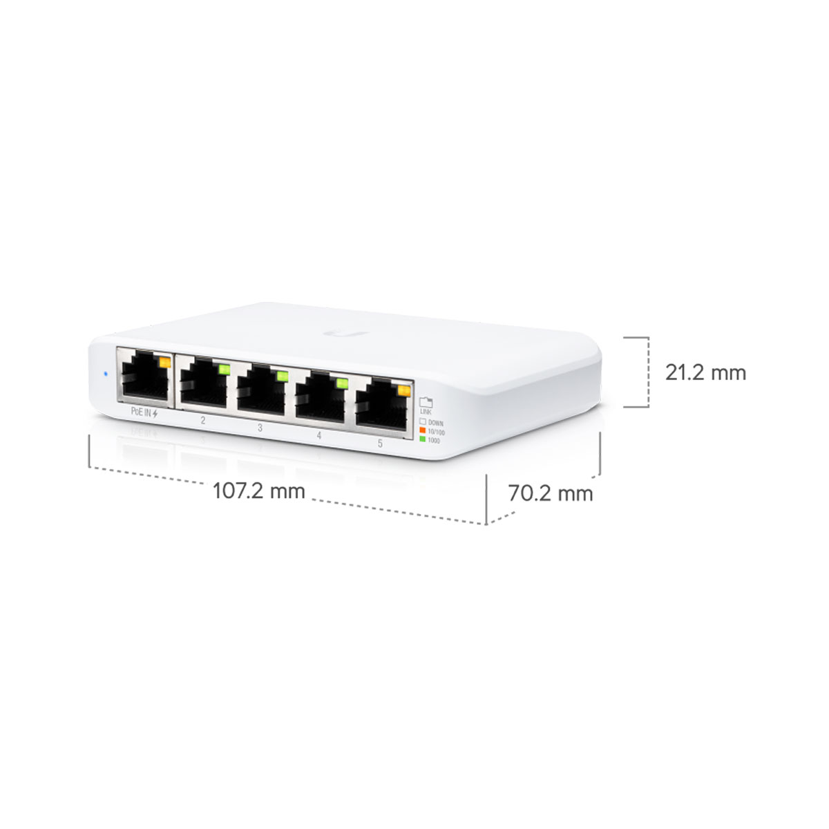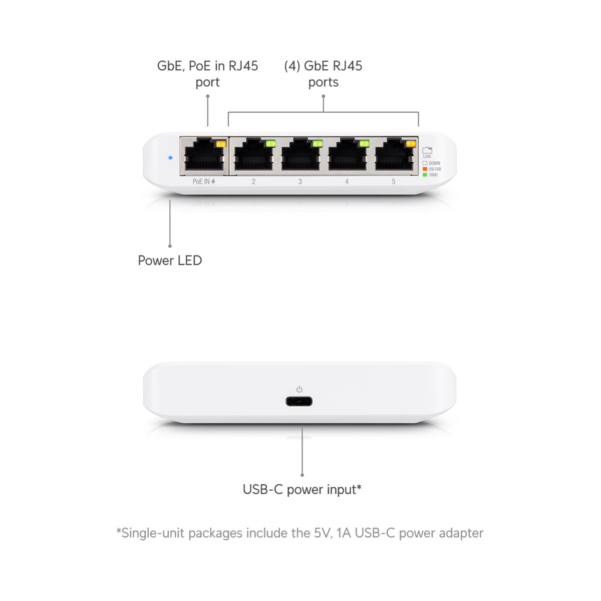 The UniFi Switch Flex Mini uses only a maximum of 2.5W. For your convenience, it can be powered by 802.3af/at PoE or a 5V, 1A USB-C power adapter*.