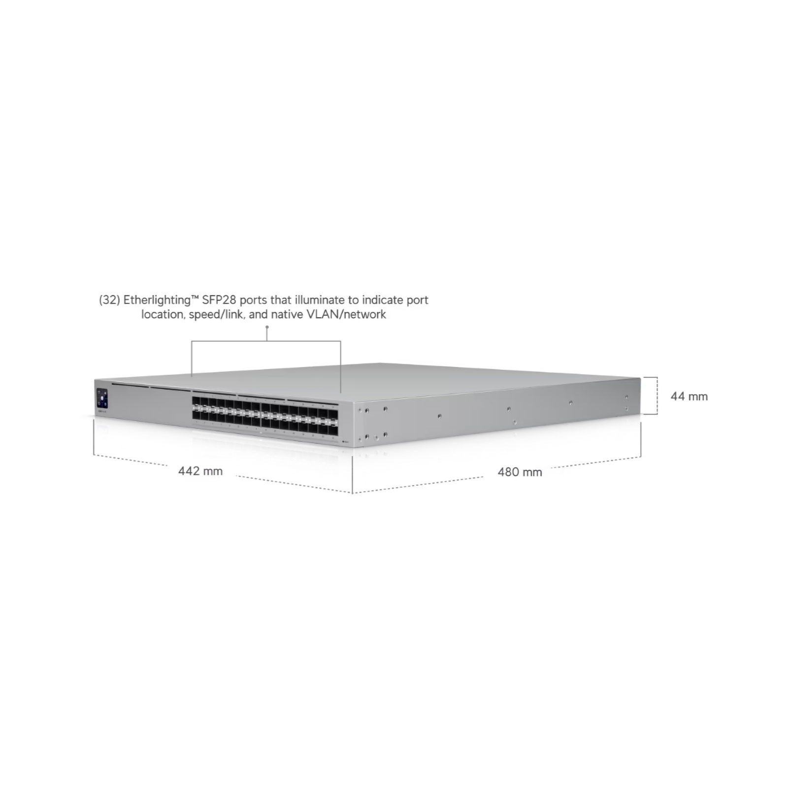 The USW-Pro-XG-Aggregation is a fully managed L3 switch in a 19" rackmount chassis featuring 32× SFP28 ports (supporting 1 G / 10 G / 25 Gbps) with the Etherlighting function, allowing you to illuminate ports in different colors to indicate port location, speed/link status, and native VLAN/network. It is equipped with a 1.3" touchscreen display capable of showing individual port statistics, error states, network load, and other information. The USW-Pro-XG-Aggregation is managed via the UniFi Controller or mobile app, enabling easy creation, scaling, and monitoring of your enterprise network.
