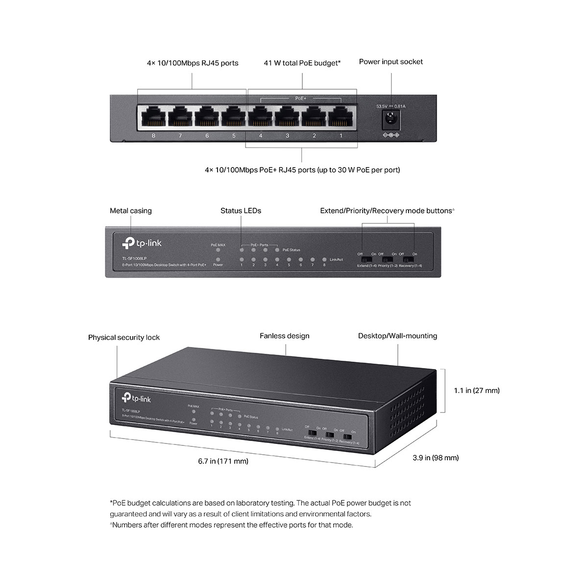 Network Ports 8*10/100 Mbps RJ45 Ports with 4 PoE+ Ports (Port 1 to Port 4)