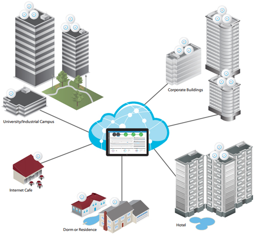 With the UniFi Controller software running in a NOC or in the cloud, system integrators can manage multiple sites: multiple, distributed deployments and multi-tenancy for managed service providers. Below are some deployment examples.
