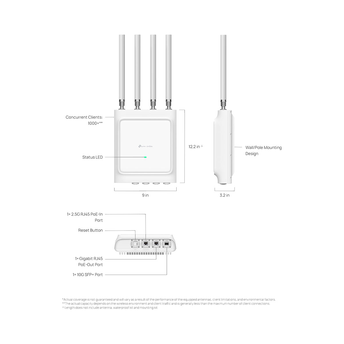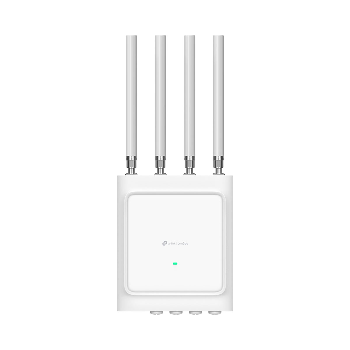 | • Ultra-Fast 3.6 Gbps Wi-Fi 6 Speeds: 1148 Mbps on 2.4 GHz and 2402 Mbps on 5 GHz.* • High-Density Connectivity: Supports up to 1,024 devices.* • Multiple Ports for Flexible Network Solutions: 1× 10G SFP+ slot, 1× 2.5G PoE-In port, and 1× Gigabit PoE-Out port. • PoE+/PoE++ Powered and PoE+ Out: Supports 802.3at/bt PoE input and 802.3at PoE output.* • Ideal for Outdoor Environments: IP68-rated weatherproof enclosure, 6 kV lightning protection, and a reliable operating range of -40 °C to +70 °C. • Advanced Features: Omada Mesh, Seamless Roaming, Bluetooth, and Centralized Cloud Management.* • High-gain Detachable Antennas: 4× External N-Type Omni Antennas, 6 dBi Dual-Band (Antennas Included). • N-Type Universal Interface: Allows to replace the included omnidirectional antennas with a directional one for flexible coverage based on deployment needs. |