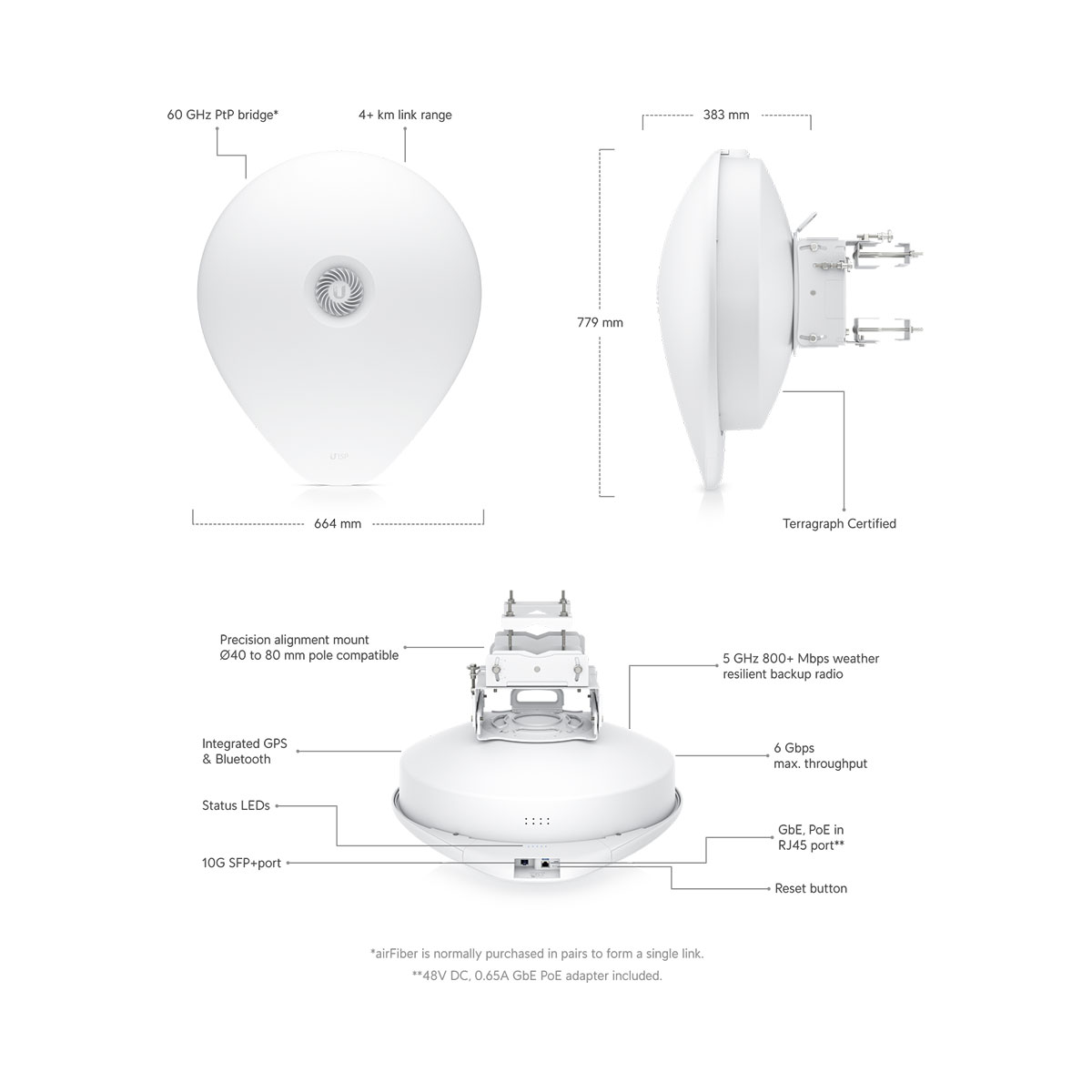 4+ km, multi-gigabit, 60 GHz bridge with SFP+ support. The airFiber 60 XG (AF60 XG) is a 60 GHz point-to-point (PtP) bridge with a built-in, 5 GHz backup radio. The AF60 XG delivers low-interference, low-latency throughput, making it an ideal component for carrier backhaul. It also features integrated GPS and a Bluetooth management radio to simplify setup and configuration.